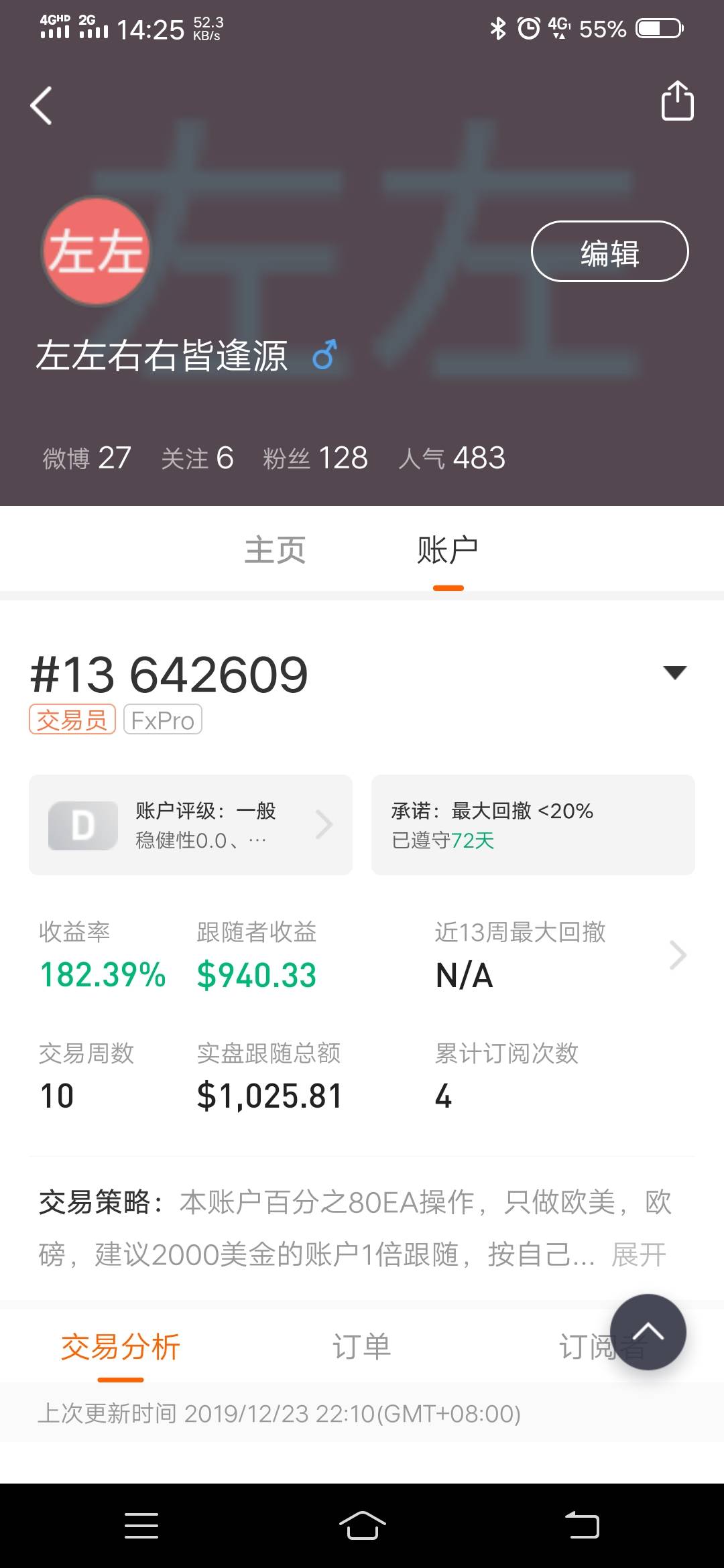 我感觉可以的啊 2000美金1倍跟随,激进的1000美金1倍跟随 今天第四天收益可以了,手数不大,浮亏不大 风险提示:本文所述仅代表作者个人观点,不代表 Followme 的官方立场。Followme 不对内容的准确性、完整性或可靠性作出任何保证,对于基于该内容所采取的任何行为,不承担任何责任,除非另有书面明确说明。