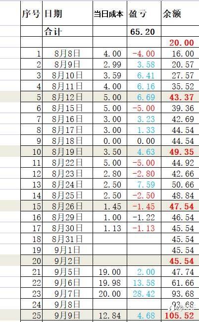 第一个月总结:我管钱和仓位,搭档负责每日18点到23点做到。这周我跟我搭档经历了很多,由于任性,他有时违规做单,每当我看到他违规,我直接一个电话过去劈头盖脸的骂!只要他超过11点还做单,我就劈头盖脸的骂!只要一扛单,我就劈头盖脸的骂!很辛苦,但是我们盈利了。继续走下去,如果方法成功了,也希望能帮助更多人。(9月5日这一周我们讨论过后,将仓位比例调大了以200美金为总资金了)