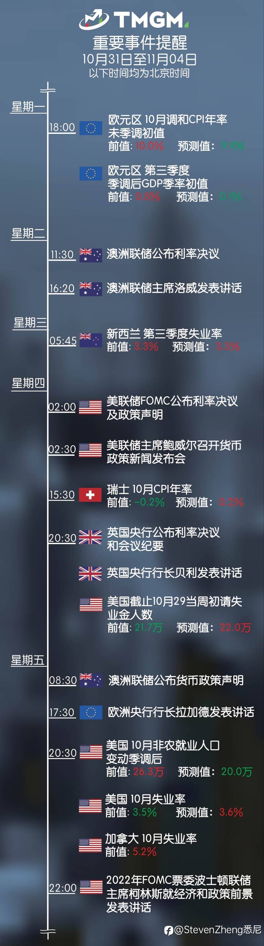 本周大事记 2022.10.31 - 2022.11.04 风险提示:本文所述仅代表作者个人观点,不代表 Followme 的官方立场。Followme 不对内容的准确性、完整性或可靠性作出任何保证,对于基于该内容所采取的任何行为,不承担任何责任,除非另有书面明确说明。