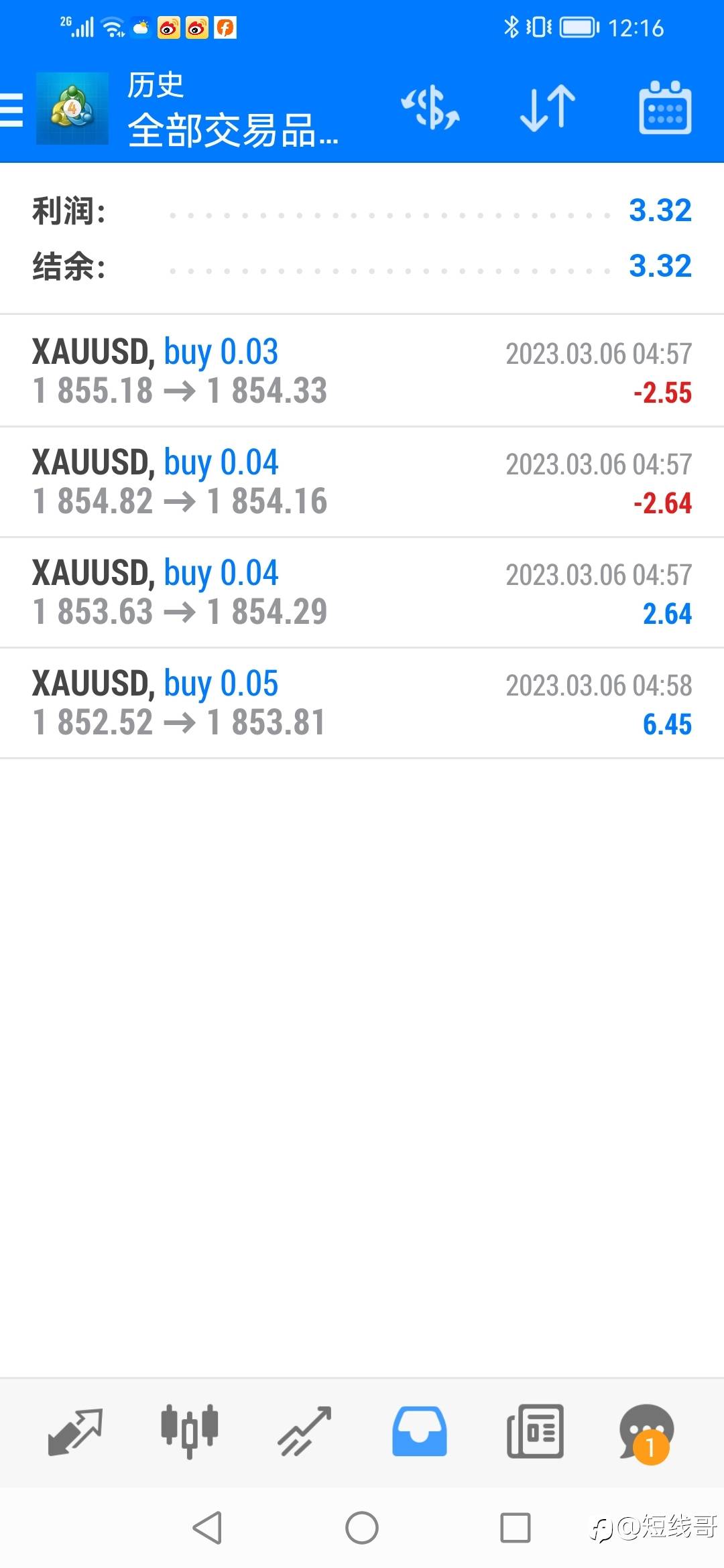 12/14目前超短线利润3.78美金 短线哥交易策略:今天短线交易主要的交易策略以回调做多为主,高空为辅,回调到1802附近可以短多一单,止损点位设在1794附近就行了。【个人建议仅供参考】 (超短线账户小风险小利润,所有的利润都是要靠慢慢累积的,别想着一步登天,稳健交易就行) 风险提示:本文所述仅代表作者个人观点,不代表 Followme 的官方立场。Followme 不对内容的准确性、完整性或可靠性作出任何保证,对于基于该内容所采取的任何行为,不承担任何责任,除非另有书面明确说明。