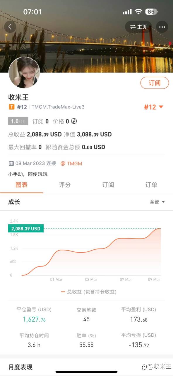 12号手动账户请大家观摩,1000本金目前7000净值。今晚单边上涨70美金,注意无数人失眠哀嚎爆仓。记住遇到这种行情一定要顺势追涨,不盲目炒顶。留个0.5过周末,看看周一有没有机会破2000美金,很大几率😍 风险提示:本文所述仅代表作者个人观点,不代表 Followme 的官方立场。Followme 不对内容的准确性、完整性或可靠性作出任何保证,对于基于该内容所采取的任何行为,不承担任何责任,除非另有书面明确说明。