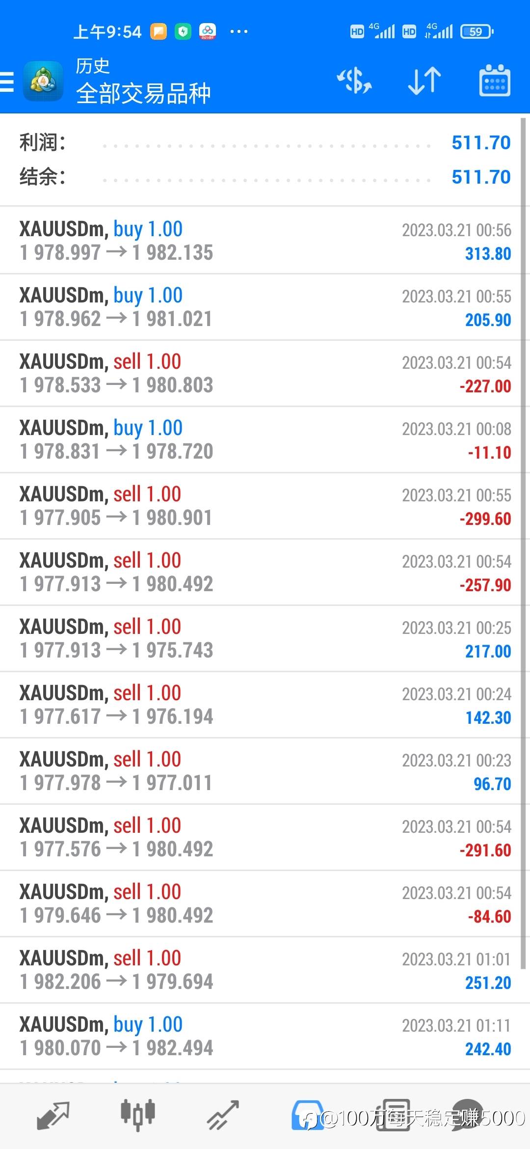 2023年4月10星期一 今日盈利3.4% 今天赚的够后面连续亏3天的 策略优化后 每天亏1%就停 严格执行。 风险提示:本文所述仅代表作者个人观点,不代表 Followme 的官方立场。Followme 不对内容的准确性、完整性或可靠性作出任何保证,对于基于该内容所采取的任何行为,不承担任何责任,除非另有书面明确说明。