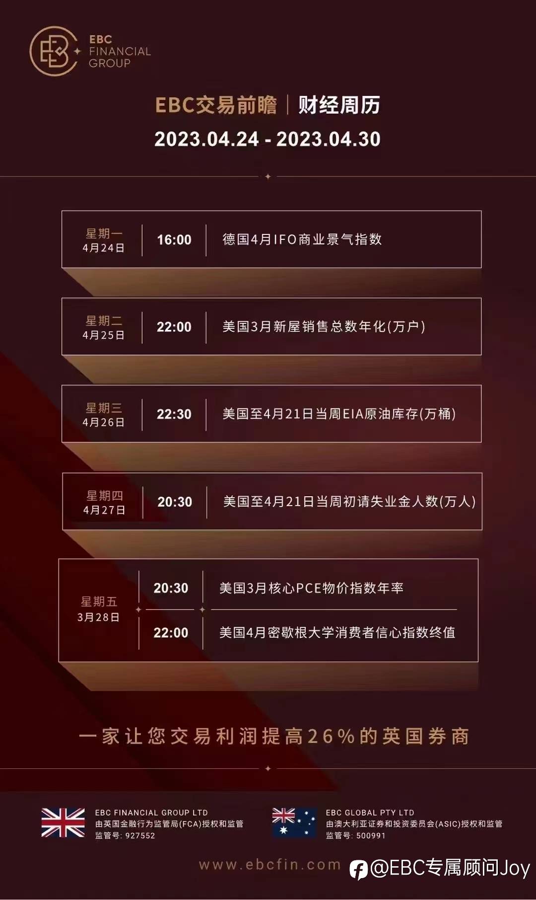 EBC交易前瞻/财经周历: 与您分享经济数据&重点事件 2023.04.17-2023.04.23 祝您交易顺达 风险提示:本文所述仅代表作者个人观点,不代表 Followme 的官方立场。Followme 不对内容的准确性、完整性或可靠性作出任何保证,对于基于该内容所采取的任何行为,不承担任何责任,除非另有书面明确说明。