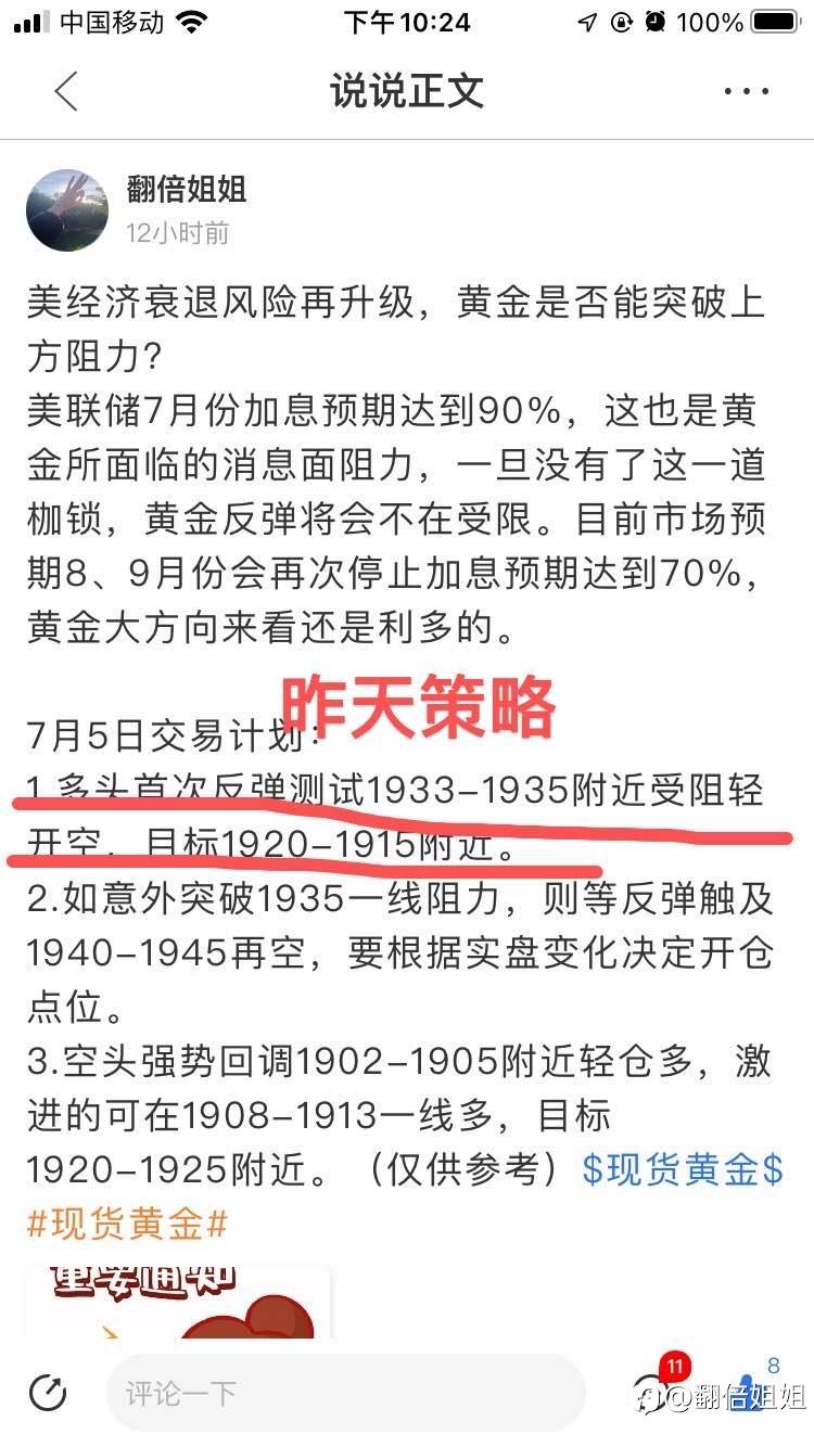 空单还差2美金就可以止盈了,止盈之后有机会我会再接多单上车。多单的话我看1970-1975区间去介入,我所有的单子都是设好止盈止损点位的,交易纪律是必须执行到底的。在市场上要想取得交易的成功其实并不需要付出太多的努力,只需要放弃你的赌徒心态,一夜暴富的幻想,把交易当作一项事业,一门生意。把交易中的止损当作经营生意中必不可少的成本,所有的盈利以止损作为成本,那你就离成功不远了#XAU/USD#