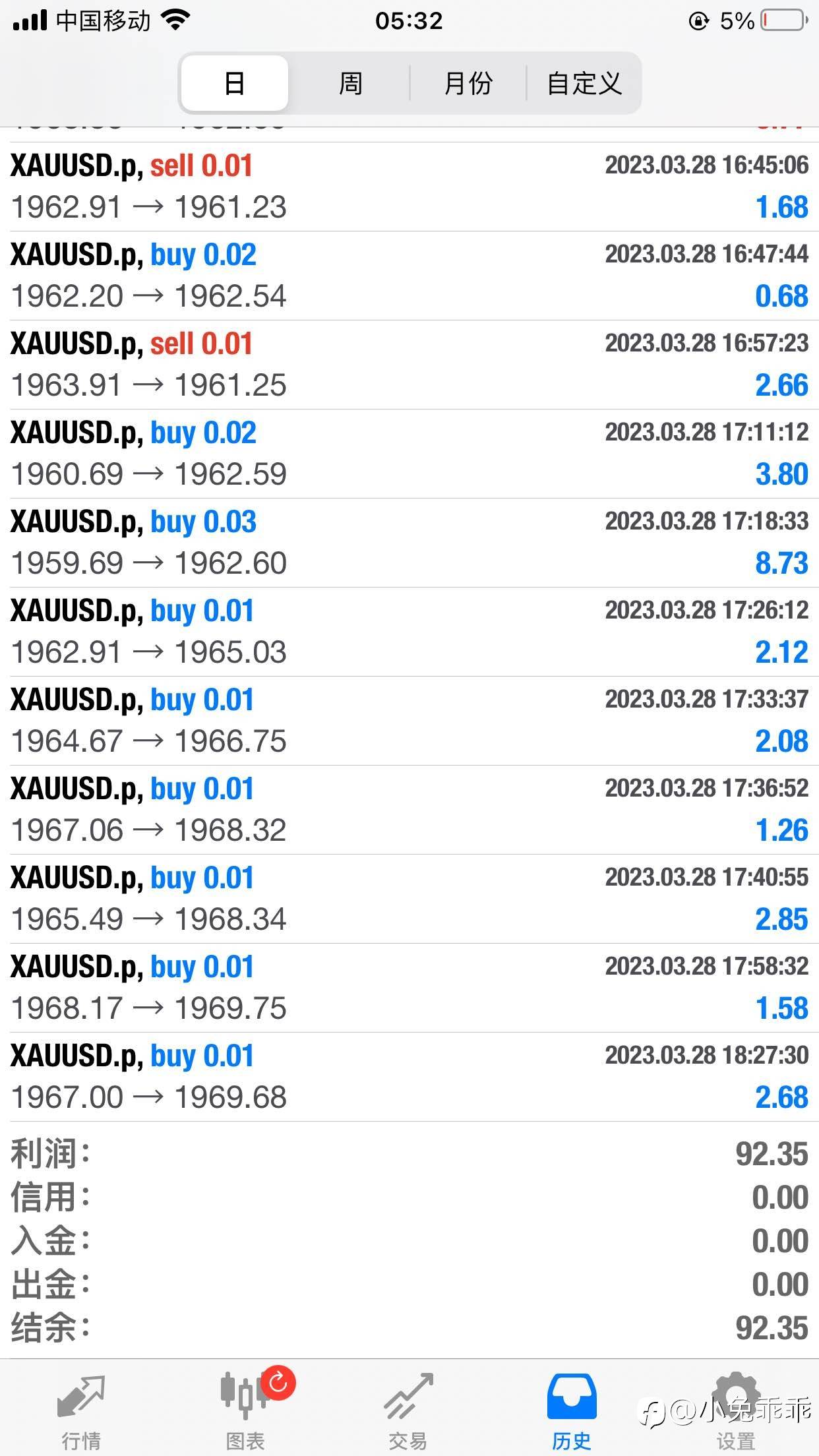 早安周末!又到周末假期,分享黄金双向对冲策略,本周超级周波动是来回奔波,周五大非农50美金波动,标准ecn账户12.15开始跑到目前利润14800比上周增加不少!微型信号0.1倍4.12日入金948到目前182.76等于标准账户1820!好信号早日关注 风险提示:本文所述仅代表作者个人观点,不代表 Followme 的官方立场。Followme 不对内容的准确性、完整性或可靠性作出任何保证,对于基于该内容所采取的任何行为,不承担任何责任,除非另有书面明确说明。