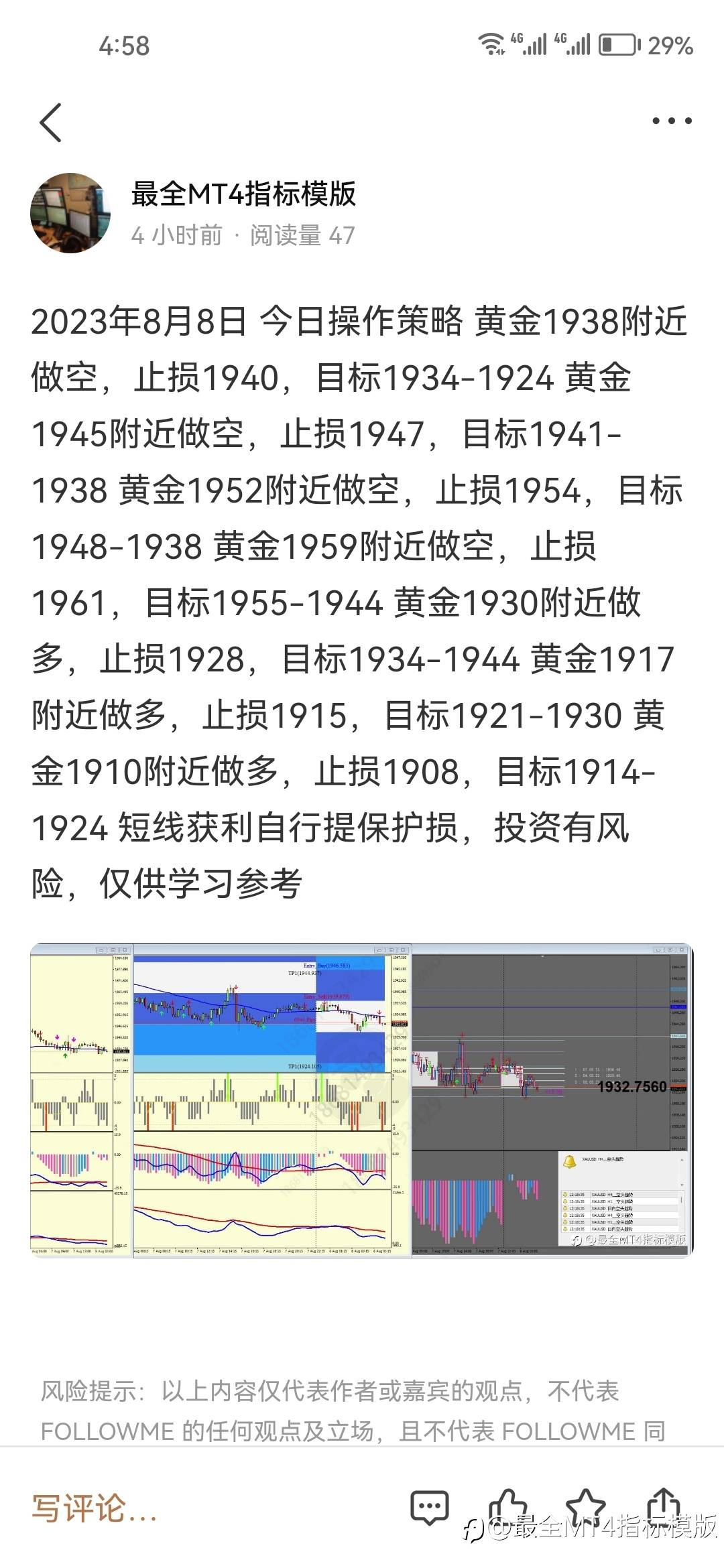2023年05月16日 今日实时解盘: 1、趋势分析:日内空头趋势运行,H1空头趋势回调反弹,H4空头趋势运行,多空因子在0轴下方排列! 2、短线操作:顺势回调做空(可选策略信号 15分钟回调空策略单/1小时回调空策略单) 需要远程看系统和全自动量化EA信号单账户可滴滴 风险提示:本文所述仅代表作者个人观点,不代表 Followme 的官方立场。Followme 不对内容的准确性、完整性或可靠性作出任何保证,对于基于该内容所采取的任何行为,不承担任何责任,除非另有书面明确说明。