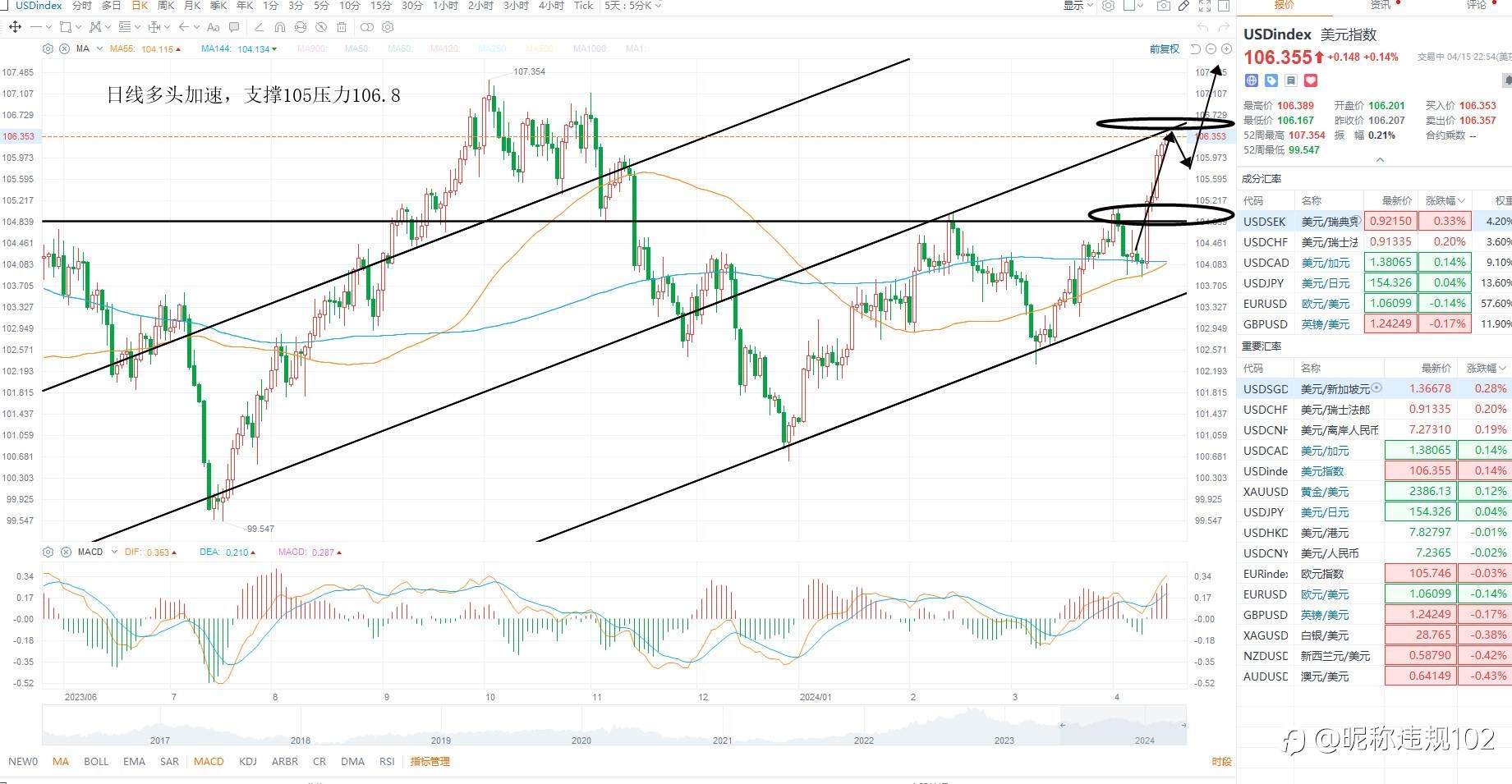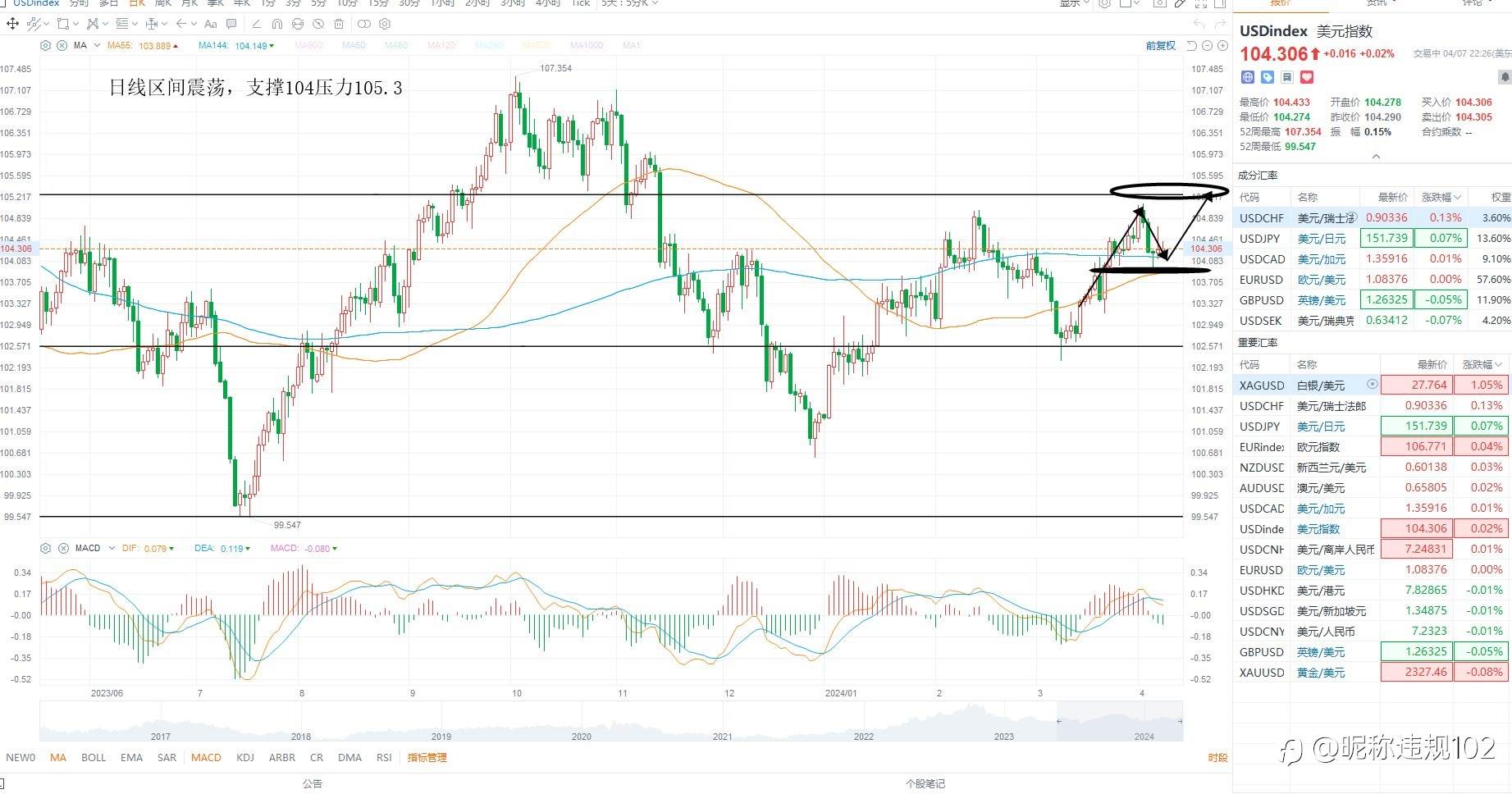 美元指数维持高位震荡,美债收益率依然维持多头排列,市场对于加息预期并未出现放缓的节奏,且转向尚未到来,在此之前,美元大概率震荡为主,基本面上等待经济数据落地,若美元站稳105美元整数关则不排除向上加速的可能性,金价方面短期维持震荡下行,二次回踩之后的等待企稳低吸机会,美原油继续走高,主要是供给端减产推动需求预期回暖,支撑油价向上加速,日内维持低吸