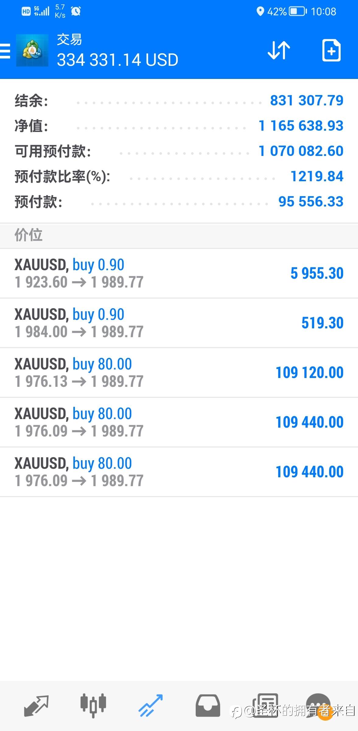 118每次300开始操作。目前1327美金,接近4倍!好多人说的账户不行,你有多牛逼,我关闭订阅就是因为没必要开放了。 风险提示:本文所述仅代表作者个人观点,不代表 Followme 的官方立场。Followme 不对内容的准确性、完整性或可靠性作出任何保证,对于基于该内容所采取的任何行为,不承担任何责任,除非另有书面明确说明。