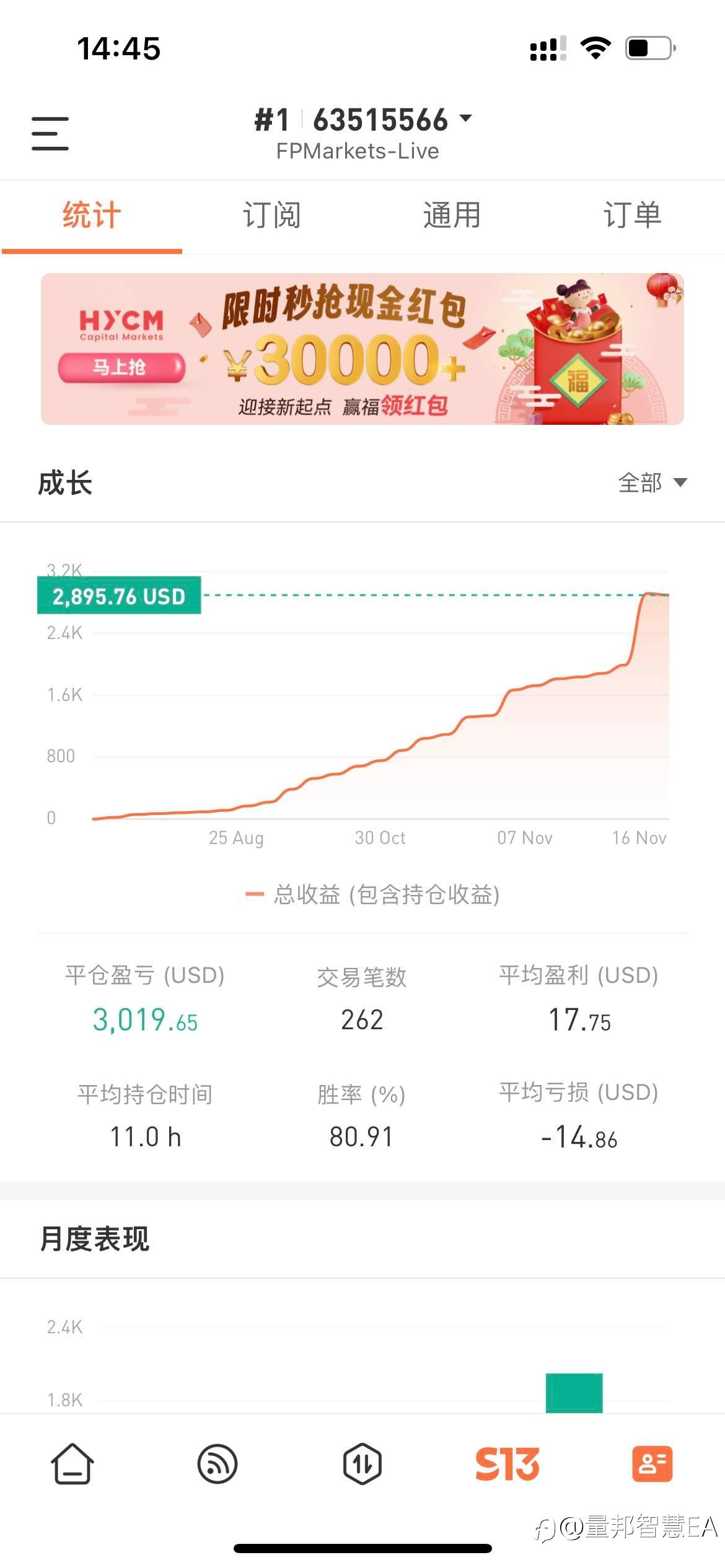 25天,也就18个交易日,已有56%收益。 胜率保持在80%以上,目前最大浮亏21.05% 观摩qq888 风险提示:本文所述仅代表作者个人观点,不代表 Followme 的官方立场。Followme 不对内容的准确性、完整性或可靠性作出任何保证,对于基于该内容所采取的任何行为,不承担任何责任,除非另有书面明确说明。