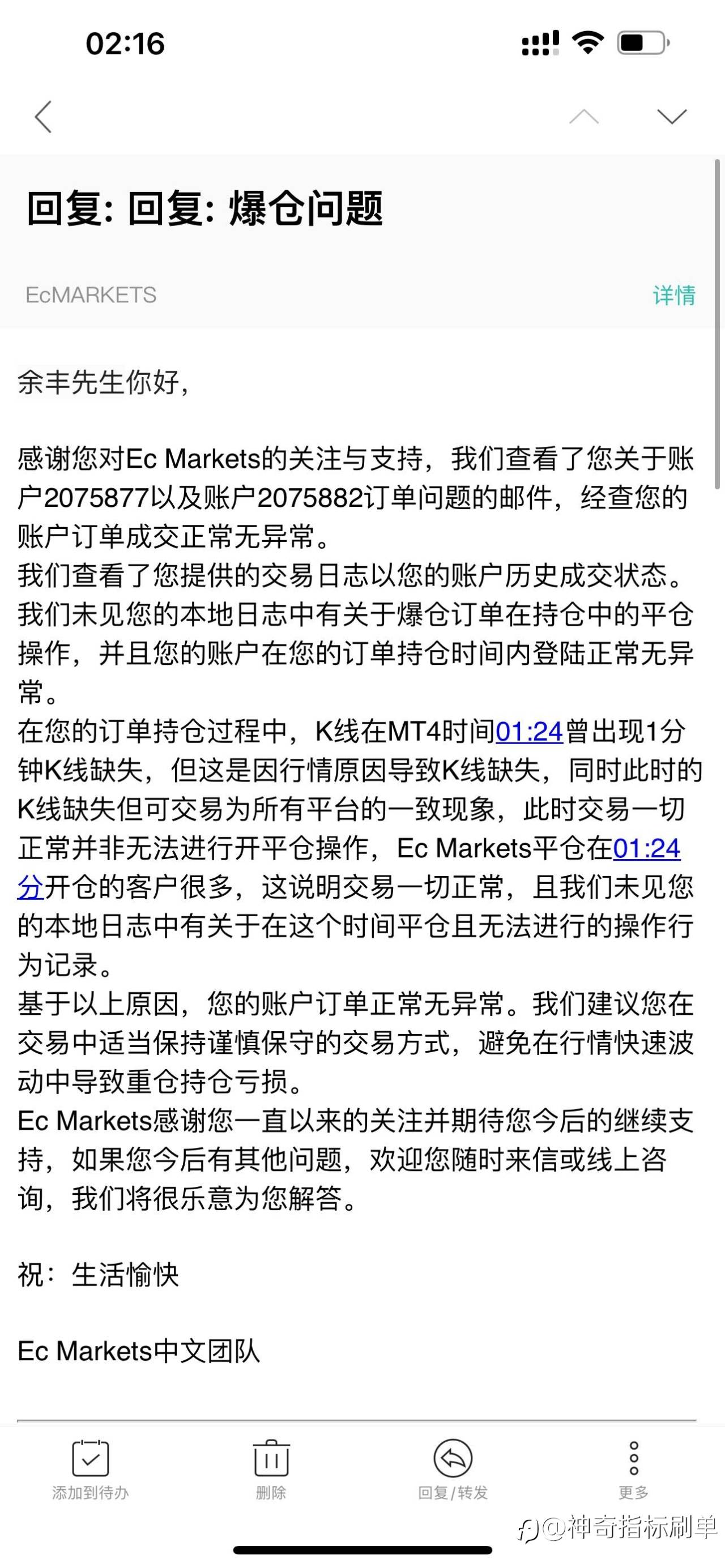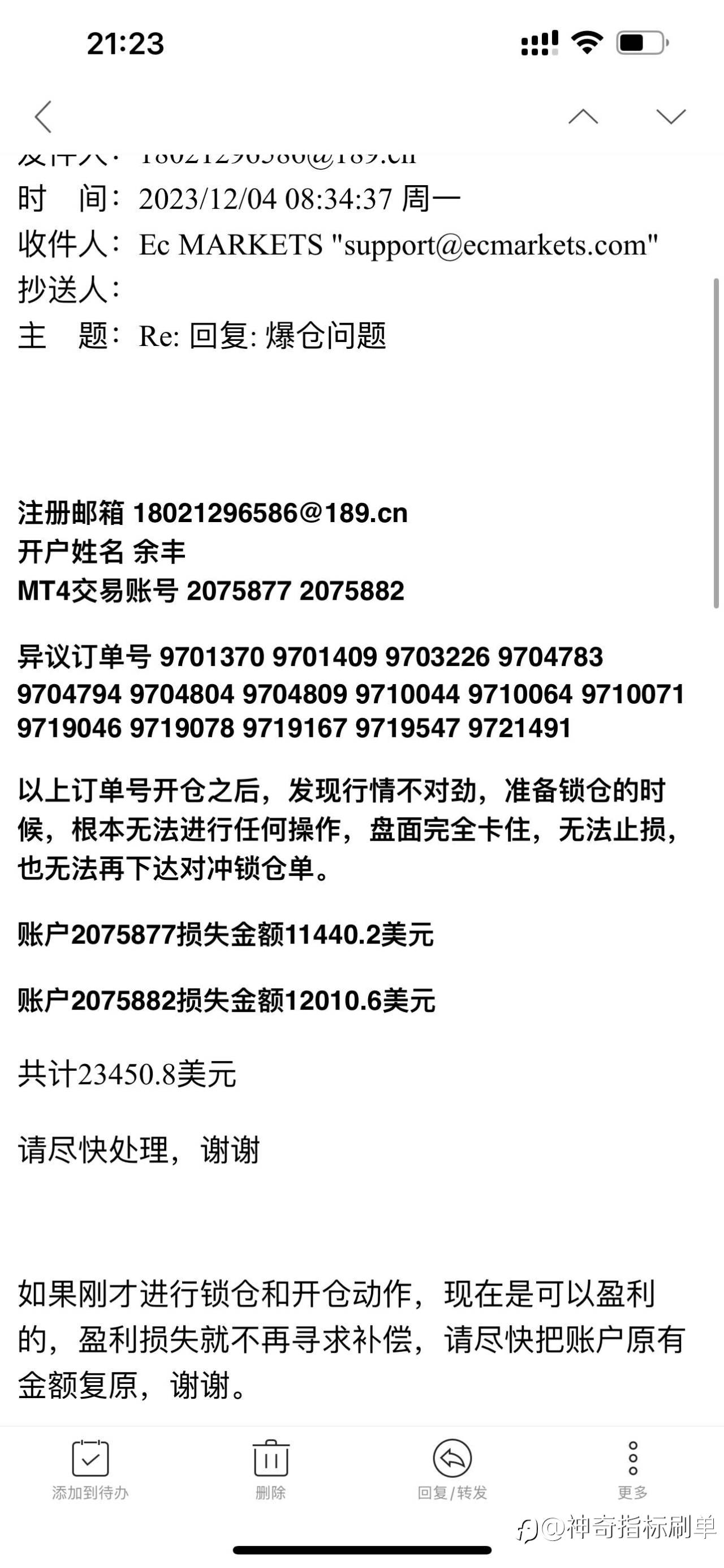 Ec MARKETS是一家非常没有准则的平台,上次1938跳水1920,几乎所有平台都已经赔付,唯独EC不给客户赔付,这次现货黄金2110之上开始卡盘,一直卡盘15分钟,导致众多汇友爆仓,又是同样的说辞,提醒各位汇友赶快出金,远离黑平台,本人已经报警,准备周一立案,下周EC的官网随时可能会被封杀,请各位汇友做好准备👊