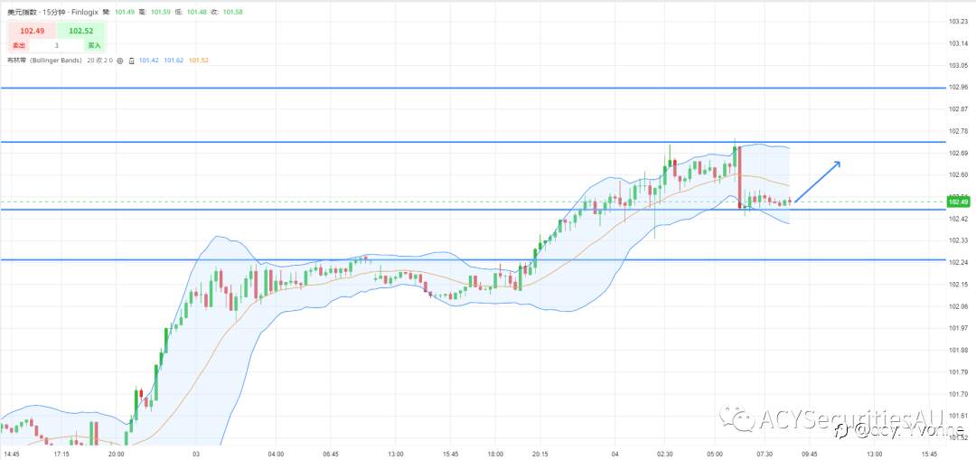 美元指数目前上升势头迅猛,重新站上102.5上方。在此前触顶102.75后,大幅回落。从布林通道来看,目前美元指数的走势在通道底部,并且逐渐向中线靠近,一旦上穿动作建立,反转形成,是一波很好的看多机会。但操作仅限小非农数据发布之前,晚上的动能方向需要配合数据情况,顺势而为。 风险提示:本文所述仅代表作者个人观点,不代表 Followme 的官方立场。Followme 不对内容的准确性、完整性或可靠性作出任何保证,对于基于该内容所采取的任何行为,不承担任何责任,除非另有书面明确说明。