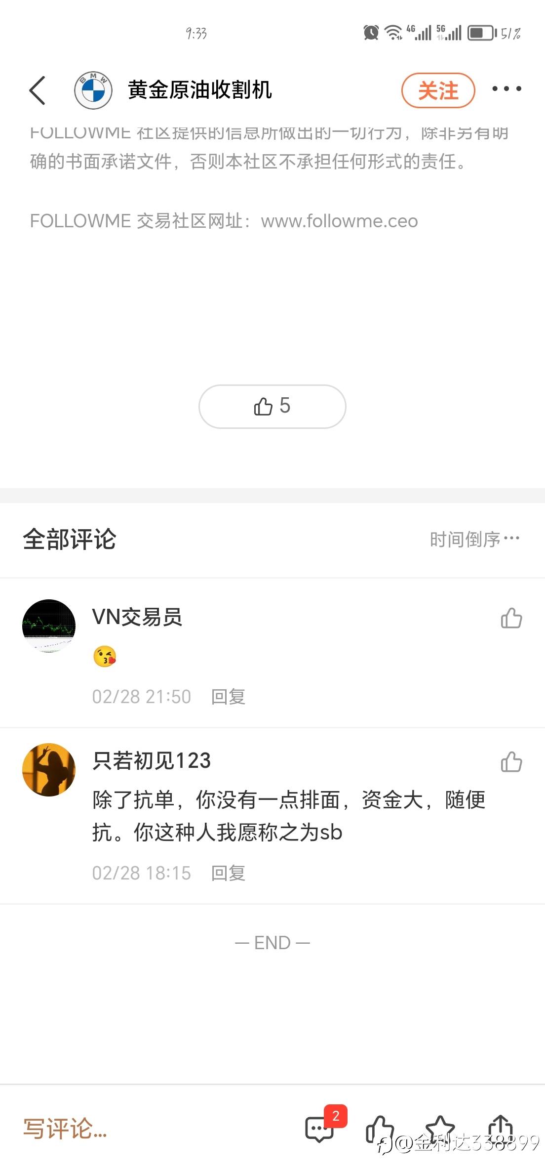 把头底下做人@黄金原油稳中求胜@黄金原油收割机@专注黄金原油顶级交易员@黄金原油短线交易员 风险提示:本文所述仅代表作者个人观点,不代表 Followme 的官方立场。Followme 不对内容的准确性、完整性或可靠性作出任何保证,对于基于该内容所采取的任何行为,不承担任何责任,除非另有书面明确说明。
