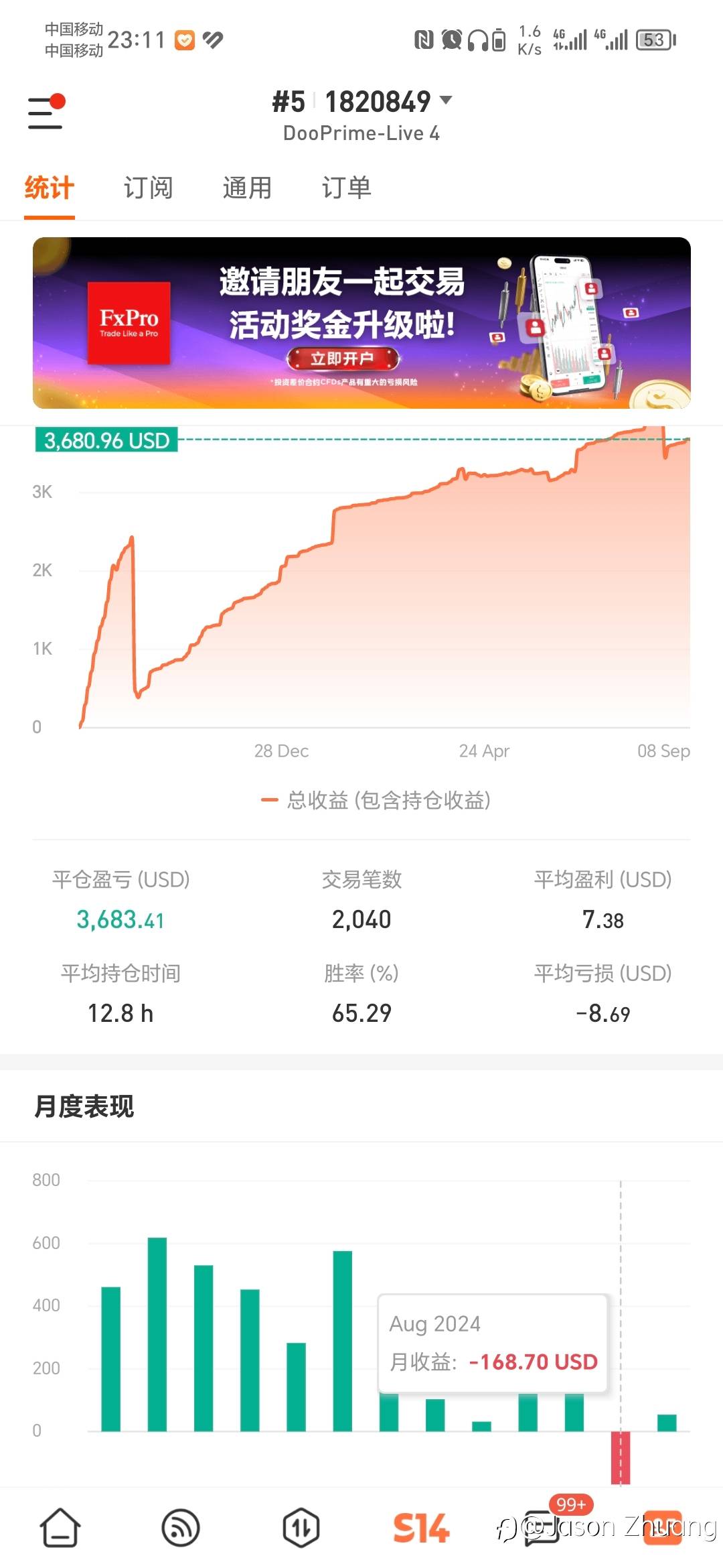 运行11个月,现在收益低,相对风险也低很多了,多数时间无单子。硬止损500.欢迎各位来看。 风险提示:本文所述仅代表作者个人观点,不代表 Followme 的官方立场。Followme 不对内容的准确性、完整性或可靠性作出任何保证,对于基于该内容所采取的任何行为,不承担任何责任,除非另有书面明确说明。