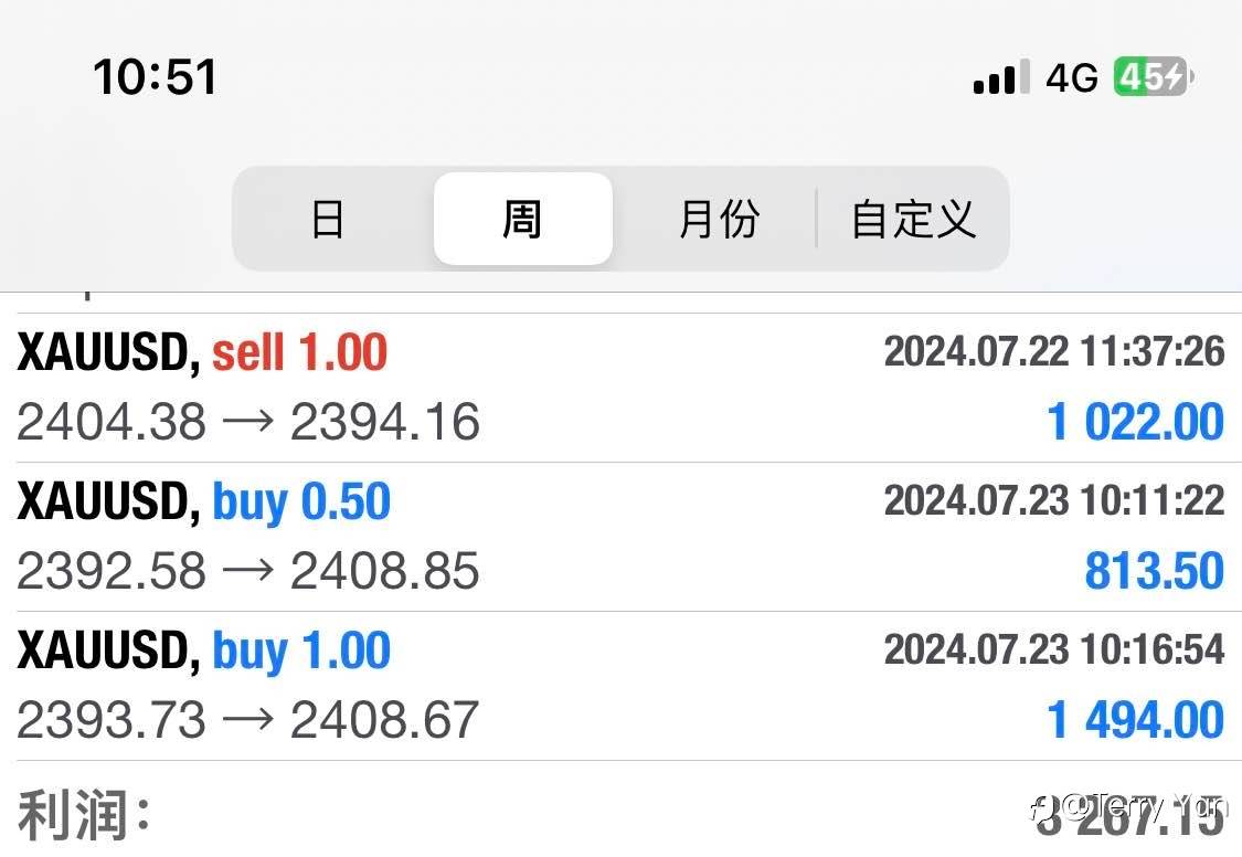 回顾上一周3倍多的利润💲、欢迎喝茶交流! 8月初,美国非农数据不佳导致美元下跌,日元、欧元和人民币升值。这反映了市场避险情绪,全球股市下跌,经济衰退担忧加剧。人民币短期升值缓解了贬值压力,但持续升值可能影响出口竞争力,股市面临下行风险。 风险提示:本文所述仅代表作者个人观点,不代表 Followme 的官方立场。Followme 不对内容的准确性、完整性或可靠性作出任何保证,对于基于该内容所采取的任何行为,不承担任何责任,除非另有书面明确说明。
