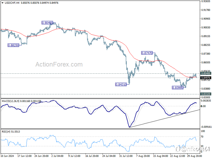 Bias intraday dalam USD/CHF tetap netral pada titik ini, dan penurunan lebih lanjut diperkirakan terjadi selama resistensi 0,8540 bertahan. Penembusan 0,8339 akan melanjutkan penurunan dari 0,9223 dan menargetkan level terendah 0,8332. Namun, dengan mempertimbangkan kondisi konvergensi bullish dalam MACD 4H, penembusan kuat 0,8540 akan mengonfirmasi titik terendah jangka pendek, dan mengubah bias kembali ke atas untuk resistensi 0,8747.