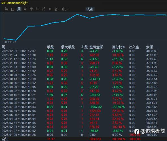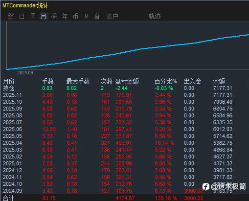 不积跬步,无以至千里,不积小流,无成江海!交易亦是如此 天秤座EA 长期稳定运行2年1个月总盈利318.85%,月均12%左右 风险提示:本文所述仅代表作者个人观点,不代表 Followme 的官方立场。Followme 不对内容的准确性、完整性或可靠性作出任何保证,对于基于该内容所采取的任何行为,不承担任何责任,除非另有书面明确说明。
