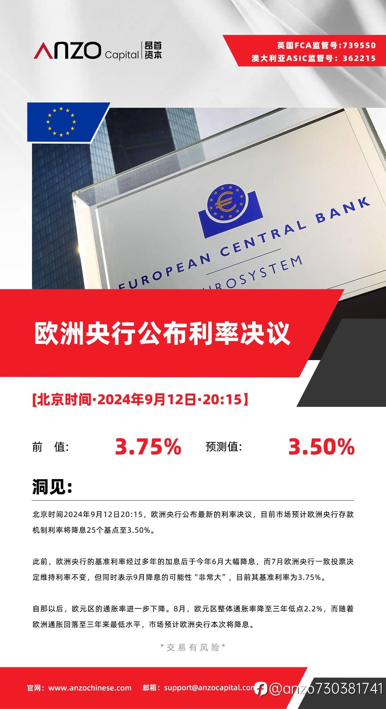 [北京时间·2024年9月12日·20:15] 欧洲央行公布利率决议,前值:3.75%,预测值:3.50%
