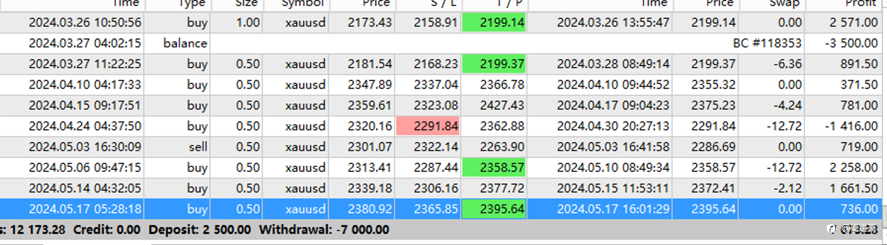 2500美金初始交易资金 中途出了3次金,一共12000美金, 入金1次,2500. 目前账户余额4700美金. 交易时间1年➕1一个月 我一共赚了多少钱🙃 风险提示:本文所述仅代表作者个人观点,不代表 Followme 的官方立场。Followme 不对内容的准确性、完整性或可靠性作出任何保证,对于基于该内容所采取的任何行为,不承担任何责任,除非另有书面明确说明。