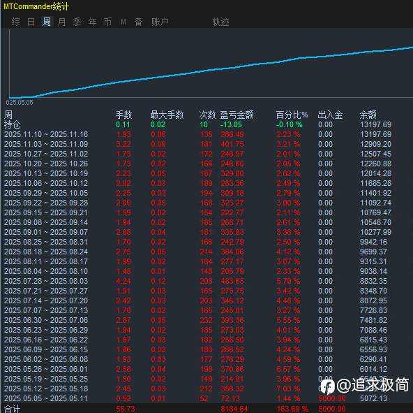 金钱之眼EA 本周盈利36.7%,实现翻500%关口,从1000增长到6086美元,截止目前4个多月总盈利508.66%,带有止损 风险提示:本文所述仅代表作者个人观点,不代表 Followme 的官方立场。Followme 不对内容的准确性、完整性或可靠性作出任何保证,对于基于该内容所采取的任何行为,不承担任何责任,除非另有书面明确说明。
