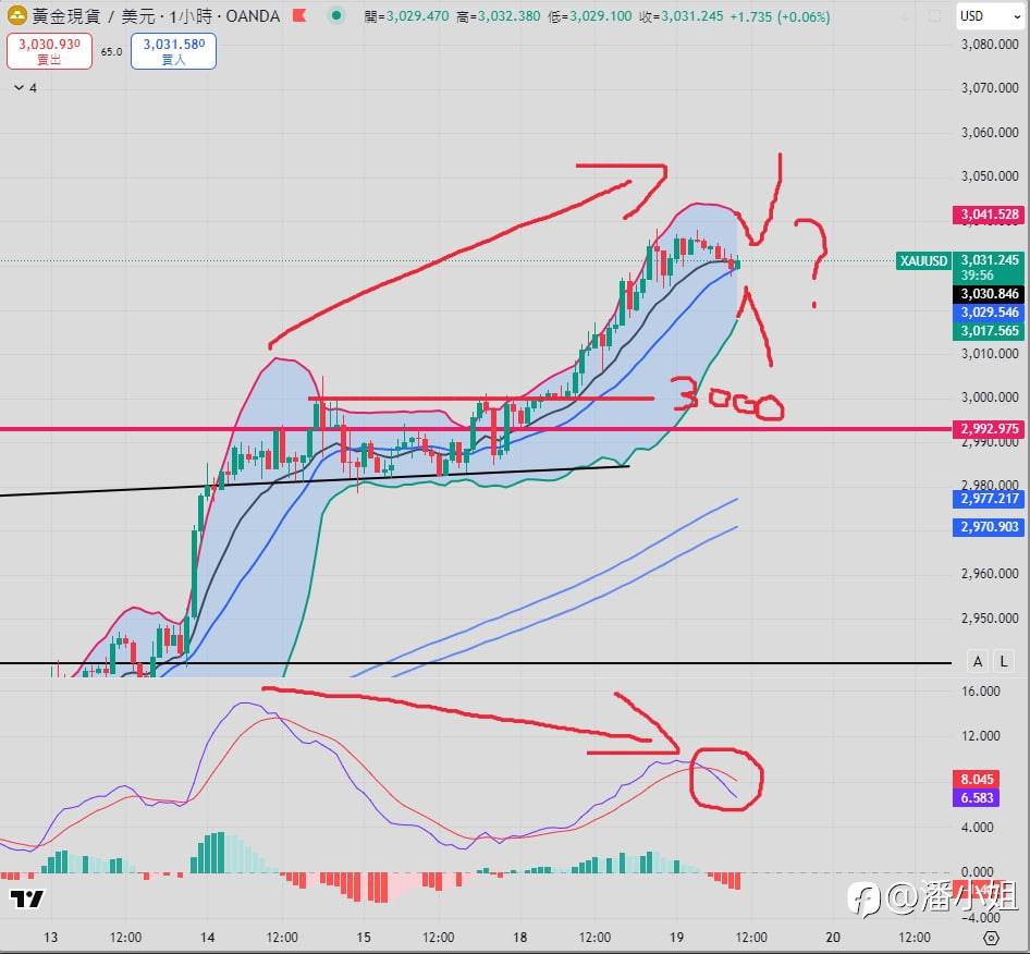 1小时布林即将缩口 等方向出来再考虑做单 最好是来一波回调到接近3000的位置 目前macd也是在背离高位往下开口 来一拨回调应该不难 最好还是低多比较安全 明早凌晨时间2点有美联储利率决议及货币政策公布 最好是美盘过后就别做单了 避免鲍威尔上台后出现飞天遁地的行情