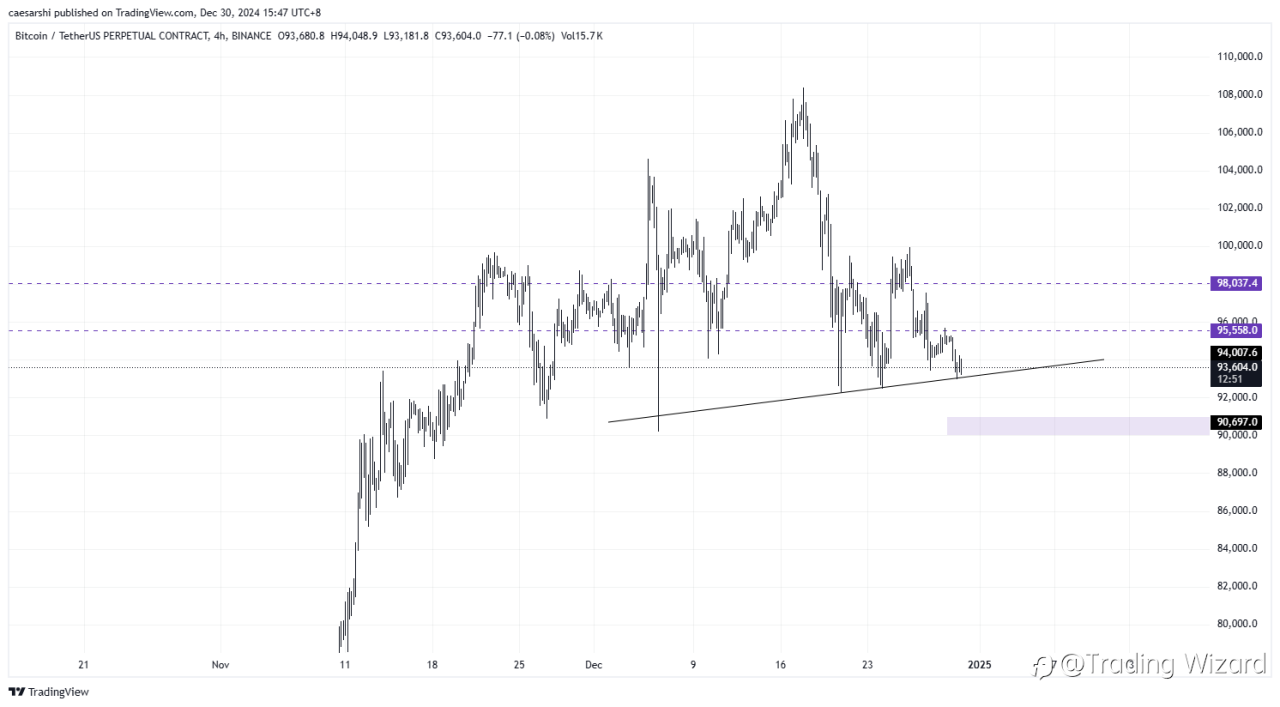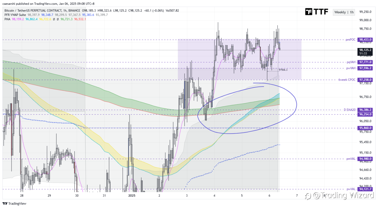 首先,從1H級別來看,維加斯隧道是走了一個有可能會出現的金叉,我們需要保持耐心,等待金叉形成,並且出現多頭排列和向上開口的空間,確立多頭的趨勢,再做出入場的動作。不止如此,在紫色陰影區域我們可以發現,比特幣一直在97500-98500中間震蕩,並且偶爾會向更低的地方做插針測試。我們也需要等待,比特幣的價格走出紫色陰影區,並進行回踩確認之後再入場。