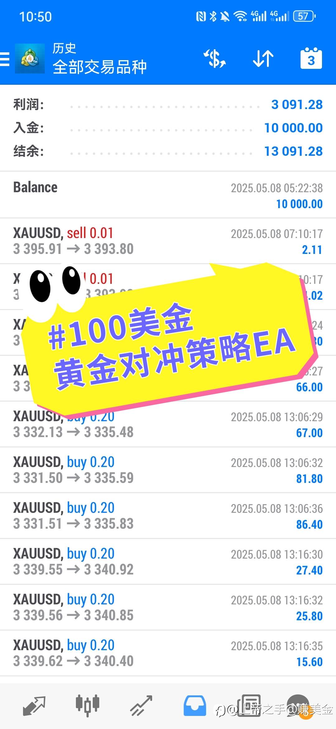 5月8日EA收割17181刀,继续躺平中…#实盘记录 #黄金交易 #EA量化交易 #期货交易 风险提示:本文所述仅代表作者个人观点,不代表 Followme 的官方立场。Followme 不对内容的准确性、完整性或可靠性作出任何保证,对于基于该内容所采取的任何行为,不承担任何责任,除非另有书面明确说明。 赞赏作者 喜欢的话,赞赏支持一下