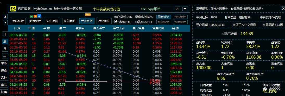 趋势EA就是这样磨磨几几,有时是几个月上不上下不下的,但他能控制在10%左右回撤,一个小趋势就能提一次上升资金曲线,但要时间,搞过马丁加码的,更加受不了,最后都放弃了。主要是要控制回撤。 在是”随波顺势“, 个名气大的资管操盘手,有多年了,一直在知呼很活跃,也有许多人线下跟了他多年了吧,应是得到证实了吧,每年都能获利七八十的一个百分比,但为什么也就那样,没有太多热点,还有许多人跟了一段时间放弃了,你看他下面的一年的统计图,一半都在输钱,谁受得了阿,能真正有耐心,懂内道的,很少的,他公开的,”随波顺势“ 但也没几个人去在意的啦。【随波顺势 】有兴趣的可以去看一下,真正的大佬,很牛的,公开有七八年了。资管超大资金,我和他不熟阿,不是为他广告,也没有投资他什么,但从客户和侧面了解了些和对他的一此理念证实运行,主要也是为了说明,一个趋势EA一般很少人能接受,因为回撤恢复周期很长很长的,与社区大部信息和聊天,全然不同观。