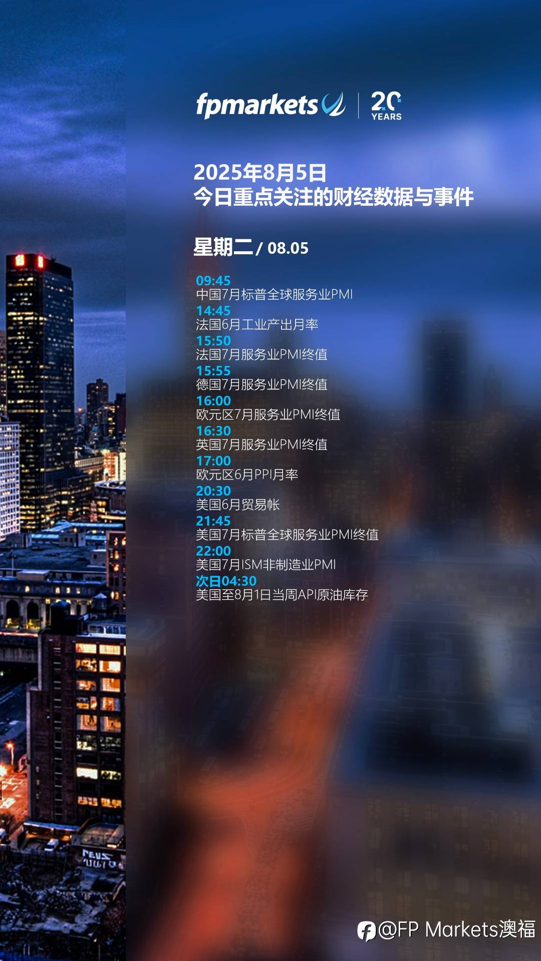 【FP Markets今日重点关注的财经数据与事件:2025年8月5日 周二】