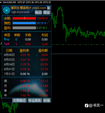25年7月末上线,自研趋势对冲量化,震荡翻倍对冲,顺势加仓,XAUUSD最低1500刀0.01手起步,月收益400-500刀,收益根据行情浮动 。起始手数根据行情资金量手动变动(大概5000-0.02)。 稳定策略请汇友们关注EA后续表现!!! 风险提示:本文所述仅代表作者个人观点,不代表 Followme 的官方立场。Followme 不对内容的准确性、完整性或可靠性作出任何保证,对于基于该内容所采取的任何行为,不承担任何责任,除非另有书面明确说明。