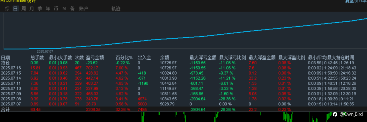 上周五的鲍威尔讲话导致黄金从最低3321到达最高3379 我用了2个实盘账号来做人工干预跟非人工干预做数据对比 非人工干预的账户最大浮亏达到4800 人工干预的账户最大浮亏达到890 我的账户马丁参数配比设计成可扛单边50美金,回调最大6美金平仓。 风险提示:本文所述仅代表作者个人观点,不代表 Followme 的官方立场。Followme 不对内容的准确性、完整性或可靠性作出任何保证,对于基于该内容所采取的任何行为,不承担任何责任,除非另有书面明确说明。