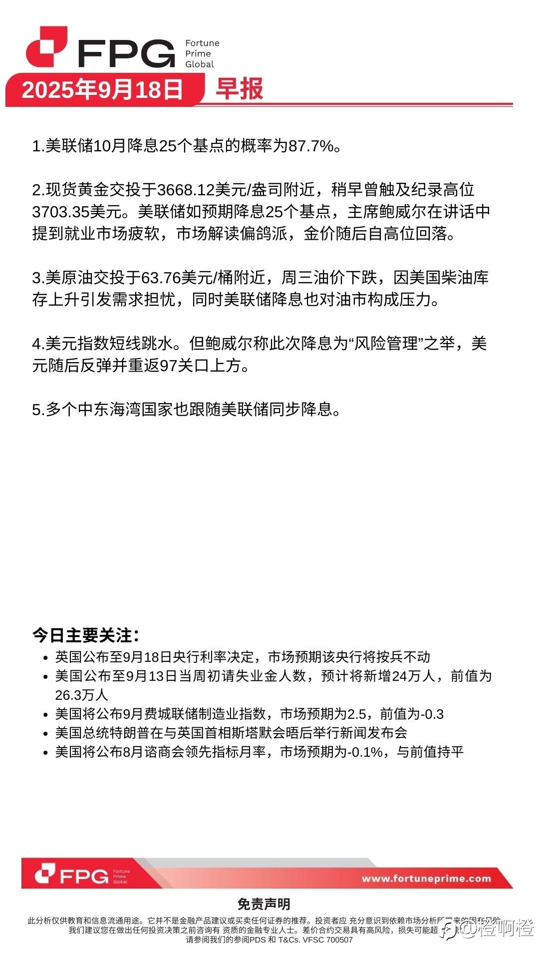 * 降息+鸽派言论本利好黄金,但市场认为未来降息节奏仍谨慎,*部分获利盘离场,金价回调*至3668美元附近。