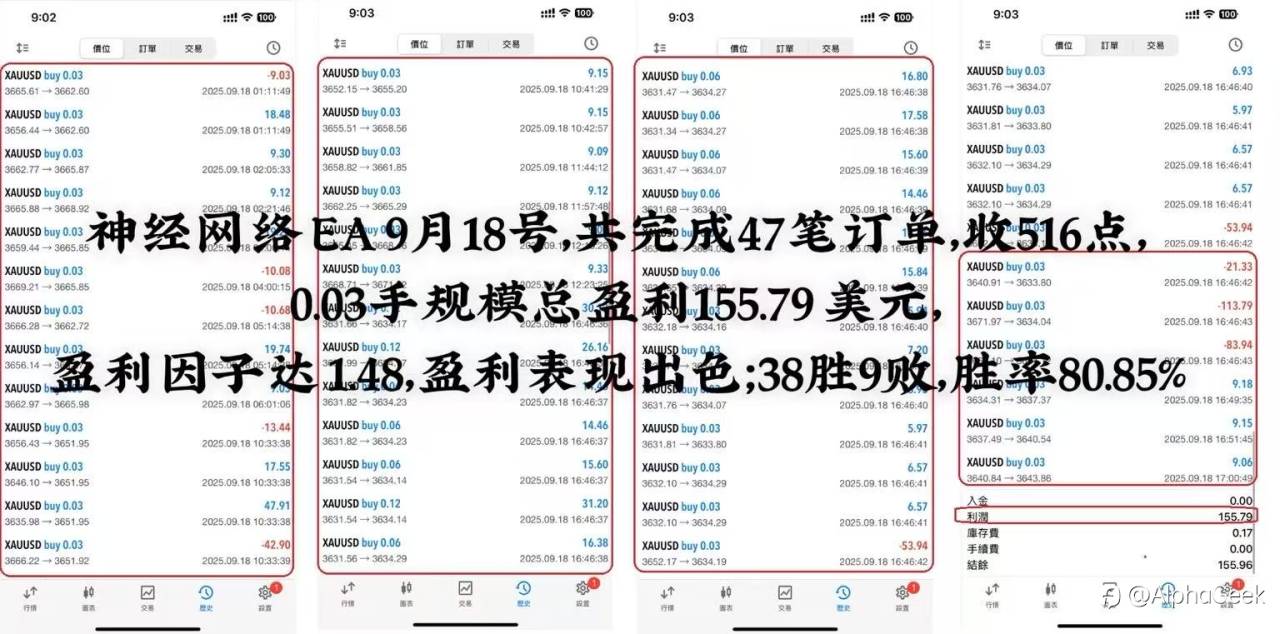 神经网络 EA 9月18号,共完成47笔订单,收516点, 0.03手规模总盈利155.79 美元, 盈利因子达 1.48,盈利表现出色; 38胜9败,胜率80.85% 风险提示:本文所述仅代表作者个人观点,不代表 Followme 的官方立场。Followme 不对内容的准确性、完整性或可靠性作出任何保证,对于基于该内容所采取的任何行为,不承担任何责任,除非另有书面明确说明。