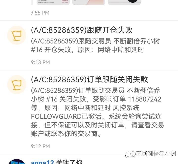 第一次遇到,亏死我了,亏损单全部跟上,盈利单没跟上开单 风险提示:本文所述仅代表作者个人观点,不代表 Followme 的官方立场。Followme 不对内容的准确性、完整性或可靠性作出任何保证,对于基于该内容所采取的任何行为,不承担任何责任,除非另有书面明确说明。