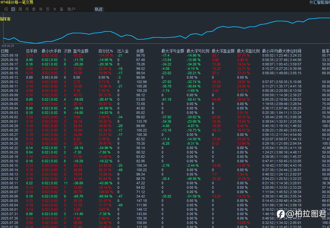 一次一单 白天做单,平均6/7单左右 固定手数0.02 本金100,作为风控信号 建议1万美金跟单,5倍跟单,日内最大回撤500,累积最大风控,可设置2500或者2000 非常稳定的一次一单 专职交易员,严格指标+AI系统,严格风控 风险提示:本文所述仅代表作者个人观点,不代表 Followme 的官方立场。Followme 不对内容的准确性、完整性或可靠性作出任何保证,对于基于该内容所采取的任何行为,不承担任何责任,除非另有书面明确说明。