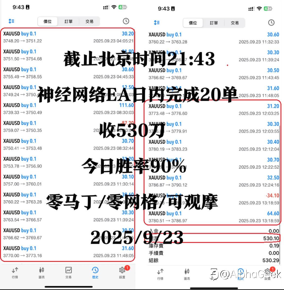 神经网络EA 日内交易实时追踪(9.23): 截止21:43,日内已收530刀;胜率90%(18胜2败) 零马丁/零网格/全自动/可观摩 风险提示:本文所述仅代表作者个人观点,不代表 Followme 的官方立场。Followme 不对内容的准确性、完整性或可靠性作出任何保证,对于基于该内容所采取的任何行为,不承担任何责任,除非另有书面明确说明。