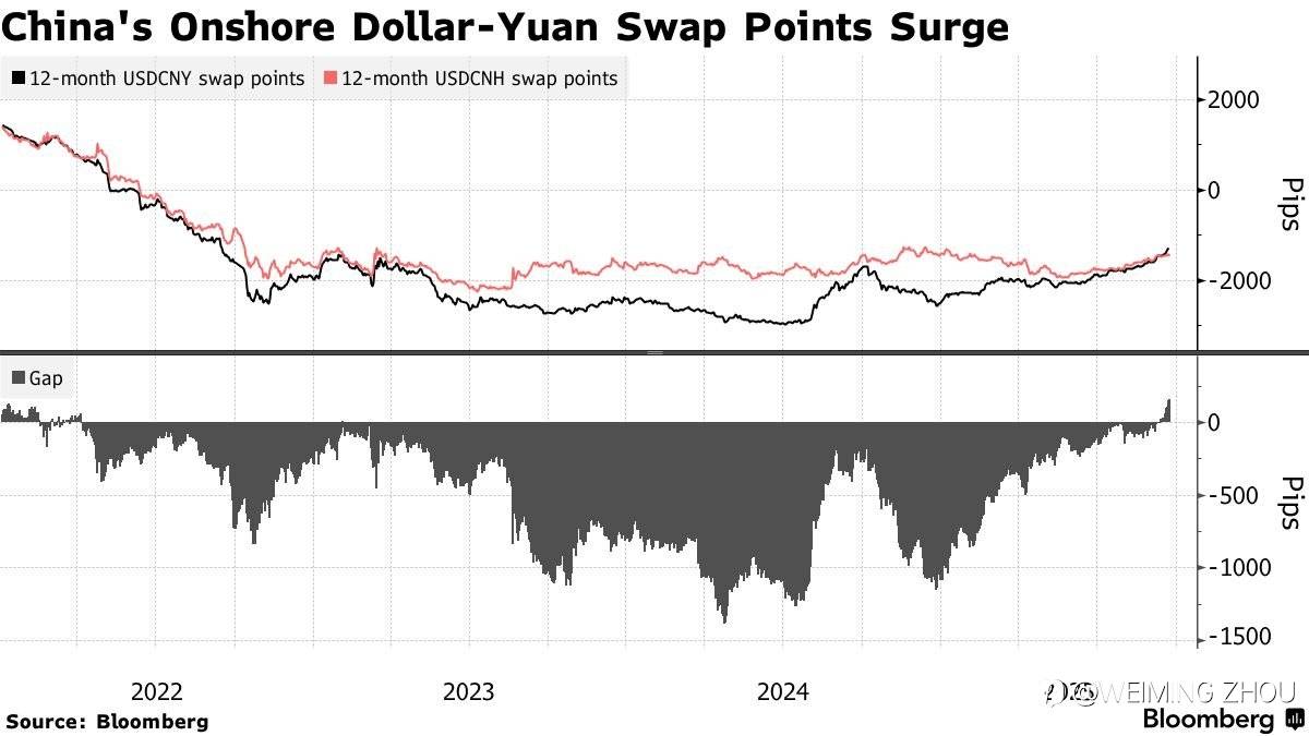 在岸人民币兑美元12个月掉期点目前处于2022年以来的最低负值,表明远期美元头寸的成本已经上升。过去几周,在岸人民币市场的掉期点也已超过离岸人民币市场,两者之间的差额达到2013年以来的最高水平,再次表明在岸市场对美元的需求旺盛。