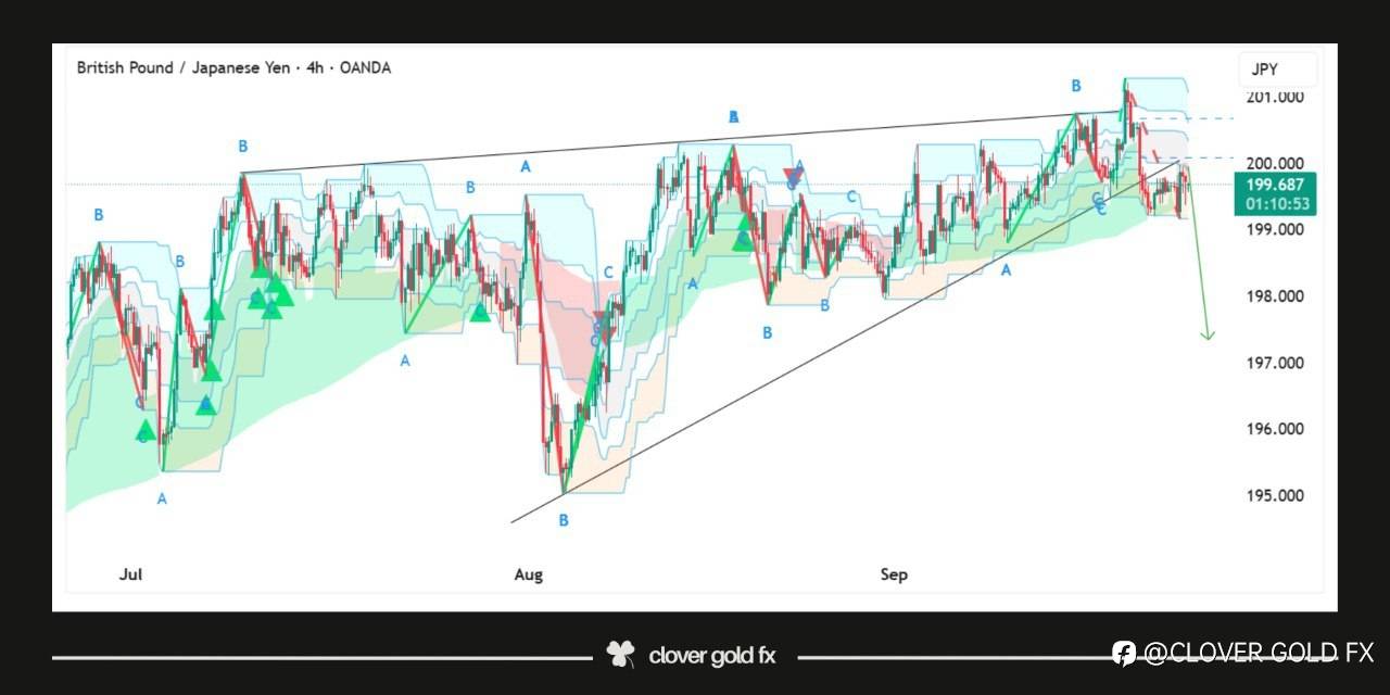 This GBPJPY 4H chart shows a clear rising wedge pattern which typically signals a potential bearish reversal. The structure has been moving in a narrowing upward channel with five completed waves suggesting exhaustion of the bullish momentum. After reaching the final wave the pair broke below the lower boundary of the wedge confirming the breakout. This indicates that sellers are gaining control and a downward move is expected. The corrective abc swings within the wedge also support the weakening structure and the breakout aligns with classical technical analysis where rising wedges often lead to a strong decline once the support line is breached.