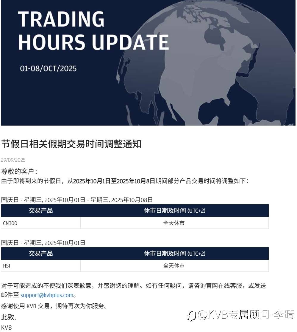 KVB节假日相关假期交易时间调整通知 @KVB 风险提示:本文所述仅代表作者个人观点,不代表 Followme 的官方立场。Followme 不对内容的准确性、完整性或可靠性作出任何保证,对于基于该内容所采取的任何行为,不承担任何责任,除非另有书面明确说明。