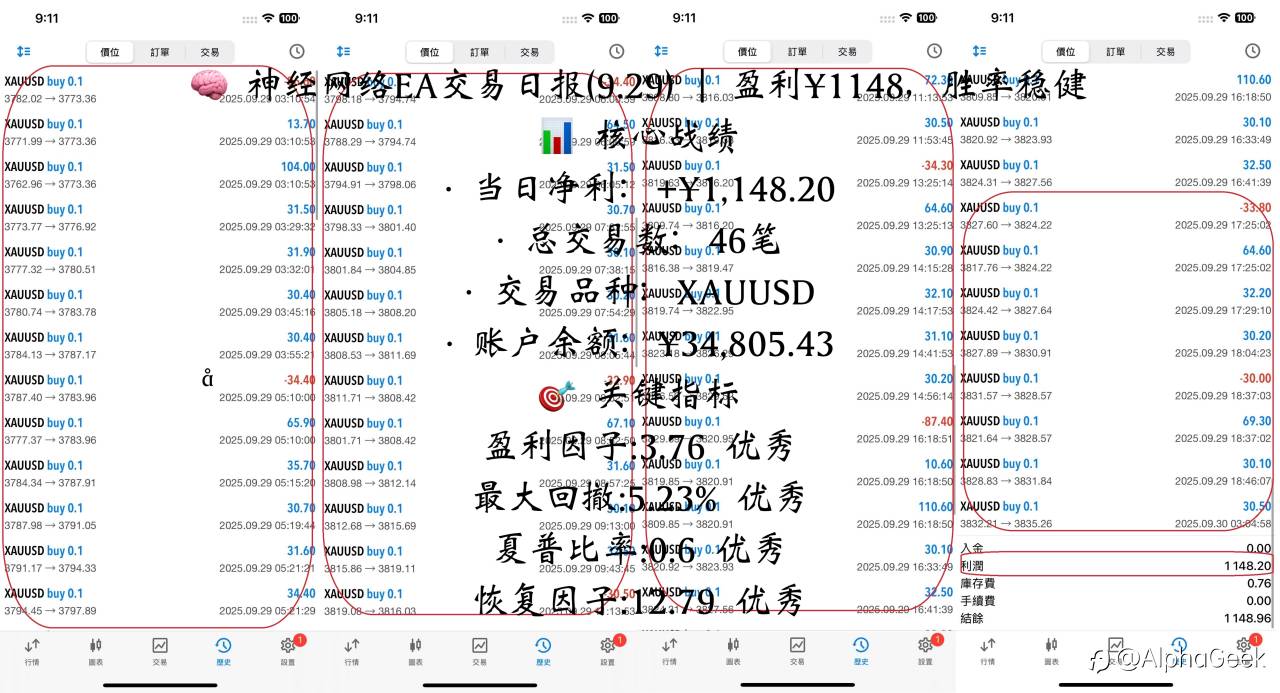 神经网络ea昨日(9.29)斩获1148美金,共完成46笔订单,止盈37单,胜率80.43%; 不熬夜、不盯盘、24小时全自动交易 风险提示:本文所述仅代表作者个人观点,不代表 Followme 的官方立场。Followme 不对内容的准确性、完整性或可靠性作出任何保证,对于基于该内容所采取的任何行为,不承担任何责任,除非另有书面明确说明。