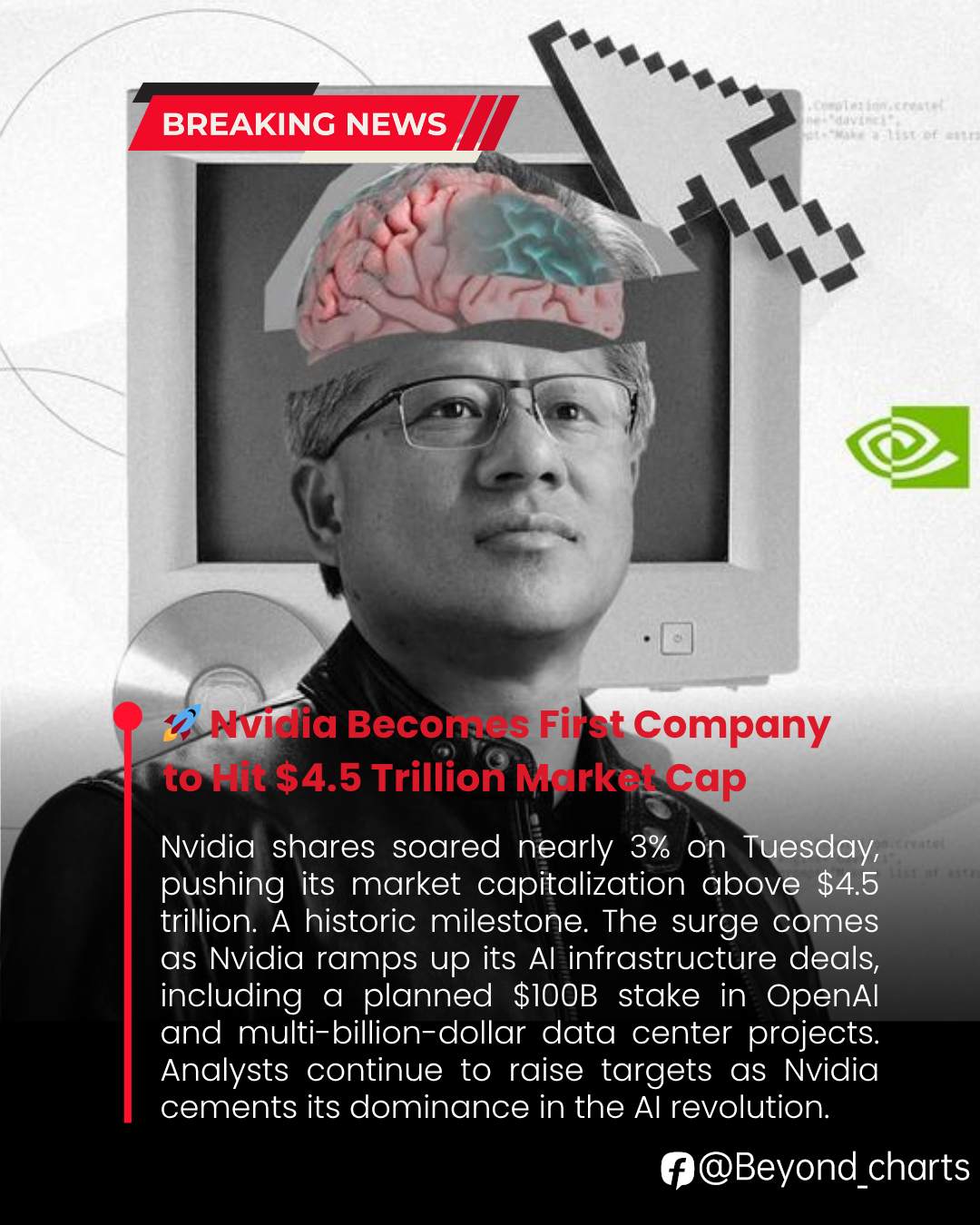 Nvidia shares surged nearly 3% yesterday, making it the first company to cross the $4.5 trillion mark. The rally is fueled by unprecedented AI infrastructure deals:
