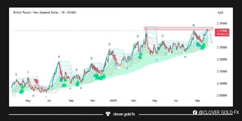 GBPNZD shows a completed five wave impulsive structure followed by a corrective ABCDE wedge pattern that indicates exhaustion of bullish momentum. Price has now returned to retest the horizontal resistance area near the previous wave five peak where sellers are expected to regain control. The rejection from this zone suggests that the pair may struggle to break higher as supply outweighs demand creating a potential reversal point. If bearish pressure builds from this resistance level the market could retrace lower toward previous demand zones confirming the end of the bullish cycle and the beginning of a corrective decline. This structure aligns with Elliott Wave theory where a corrective phase typically follows a completed five wave impulse.