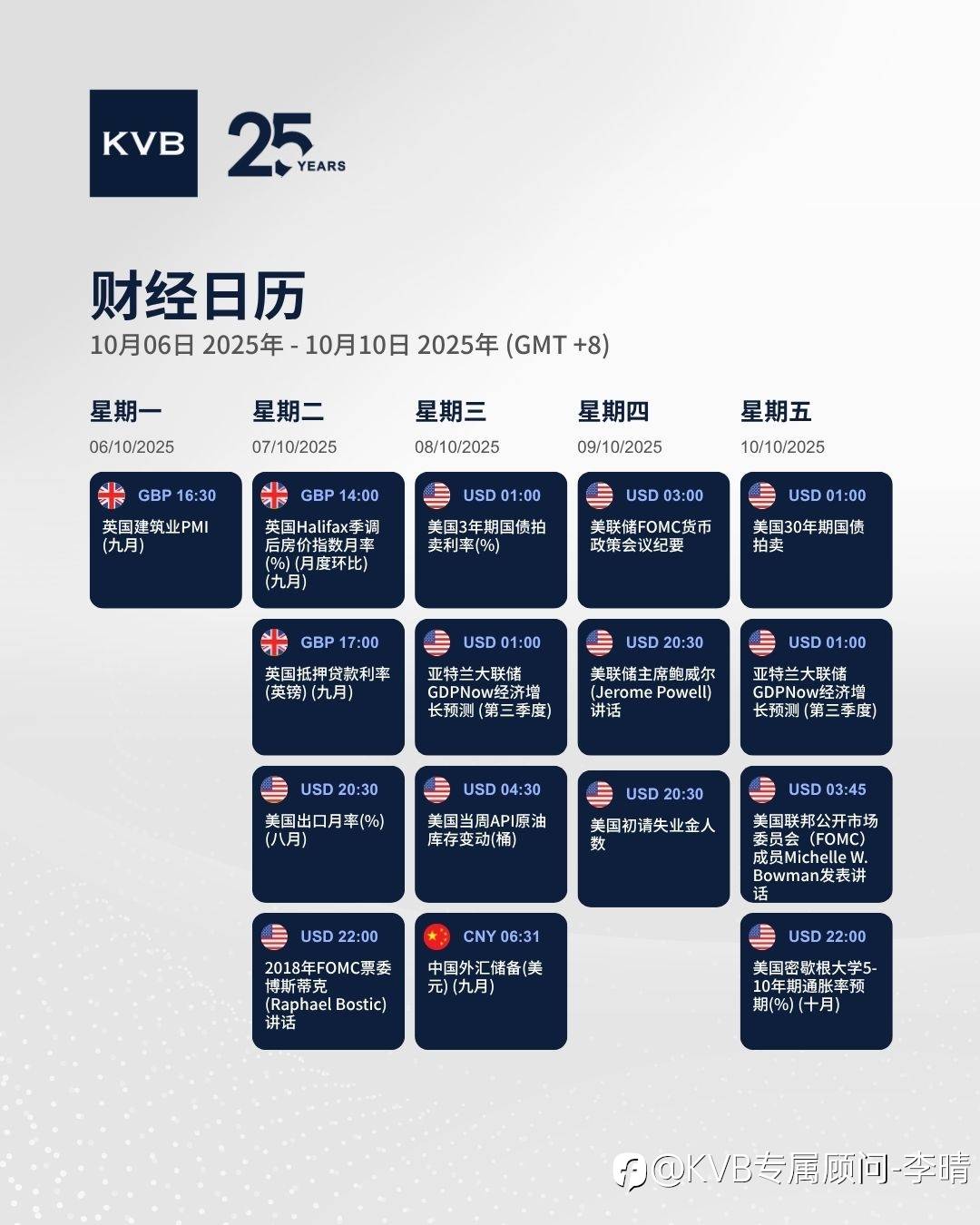 本周经济日历(10月6日-10日)@KVB 风险提示:本文所述仅代表作者个人观点,不代表 Followme 的官方立场。Followme 不对内容的准确性、完整性或可靠性作出任何保证,对于基于该内容所采取的任何行为,不承担任何责任,除非另有书面明确说明。