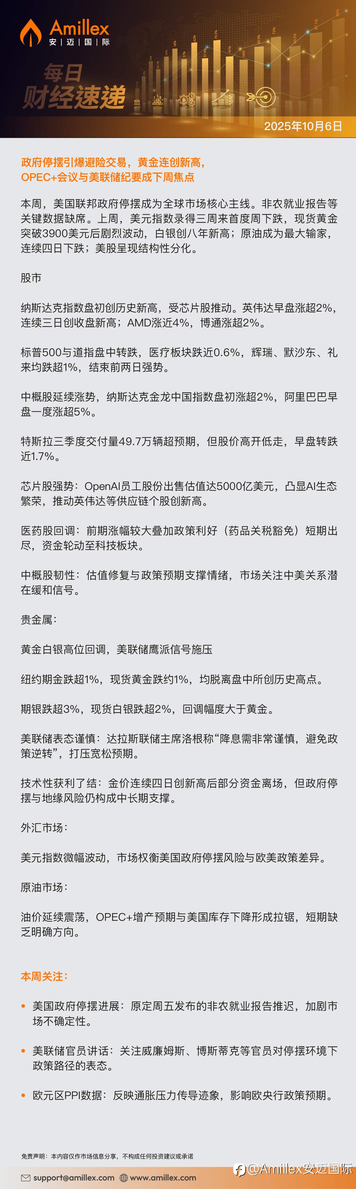 Amillex每日汇评:政府停摆引爆避险交易,黄金连创新高,OPEC+会议与美联储纪要成下周焦点 风险提示:本文所述仅代表作者个人观点,不代表 Followme 的官方立场。Followme 不对内容的准确性、完整性或可靠性作出任何保证,对于基于该内容所采取的任何行为,不承担任何责任,除非另有书面明确说明。