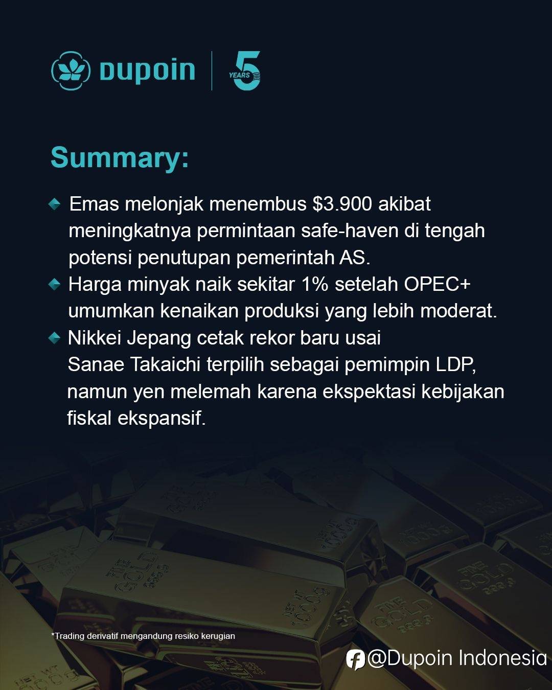 Ketidakpastian global kembali mendominasi pasar — emas menembus level $3.900 karena investor beralih ke aset aman, sementara OPEC+ menahan kenaikan produksi minyak. Di Asia, Nikkei Jepang mencetak rekor baru, tapi yen justru melemah seiring ekspektasi kebijakan longgar dari pemerintah baru Jepang.