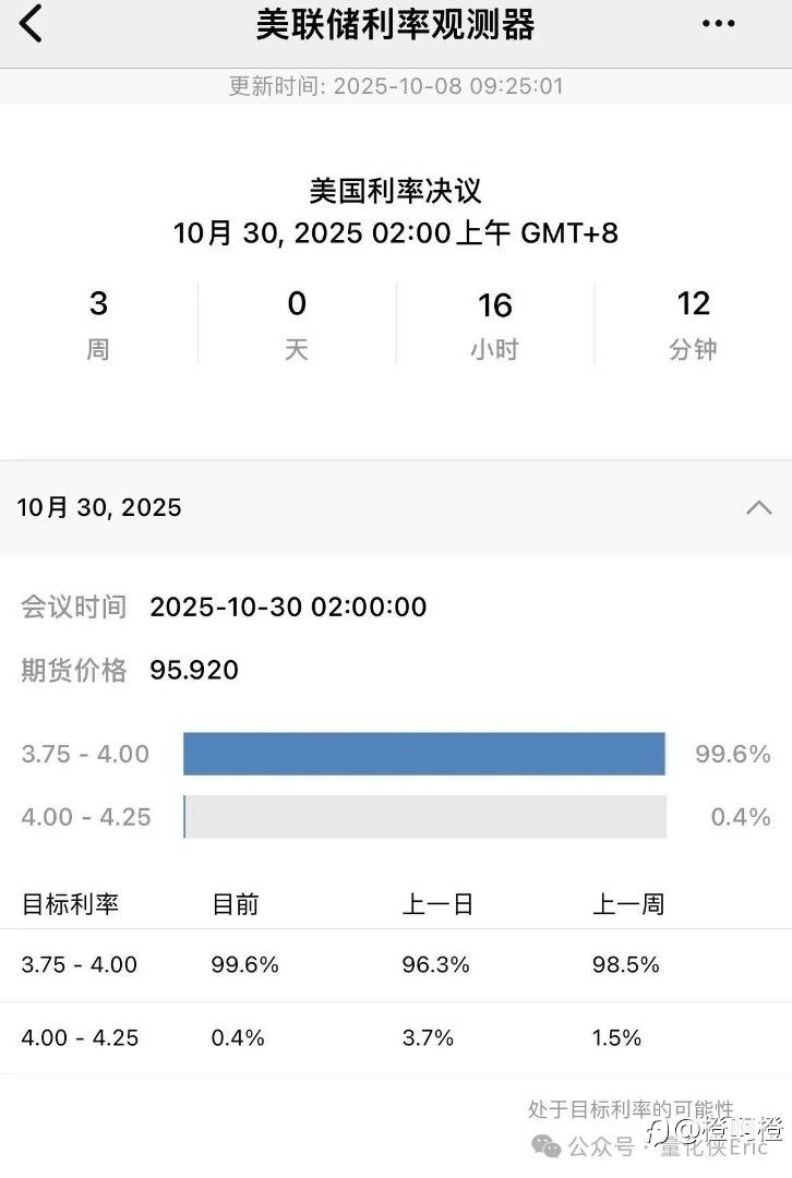 市场预测:10月降息25基点概率达 99%,12月再度降息50基点概率约 81%。