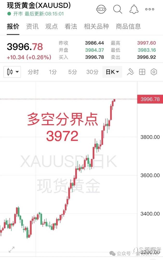 国际金价今日多空分界点在 3972美元/盎司,亚盘一度拉升至 3999美元,随后快速回调约15美元,短线波动明显。(见图)