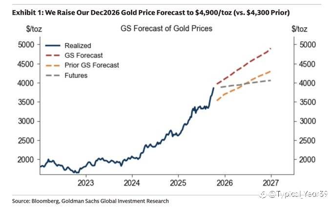 #Goldman# Sachs also raised its target for gold price for 2026 to a whopping 4900/oz, very close to 5000.