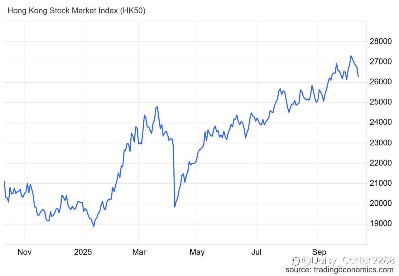 The Hang Seng fell 462 pts (-1.7%) to 26,290, extending its fifth straight loss as tech stocks slid over 3% amid China’s tighter rare earth and chip export controls. Consumer shares also declined before next week’s key China data.