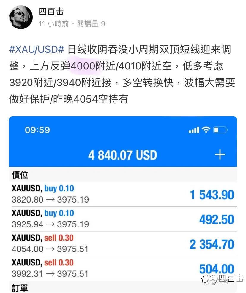 #XAU/USD# 4000空回撤3980附近收下 风险提示:本文所述仅代表作者个人观点,不代表 Followme 的官方立场。Followme 不对内容的准确性、完整性或可靠性作出任何保证,对于基于该内容所采取的任何行为,不承担任何责任,除非另有书面明确说明。