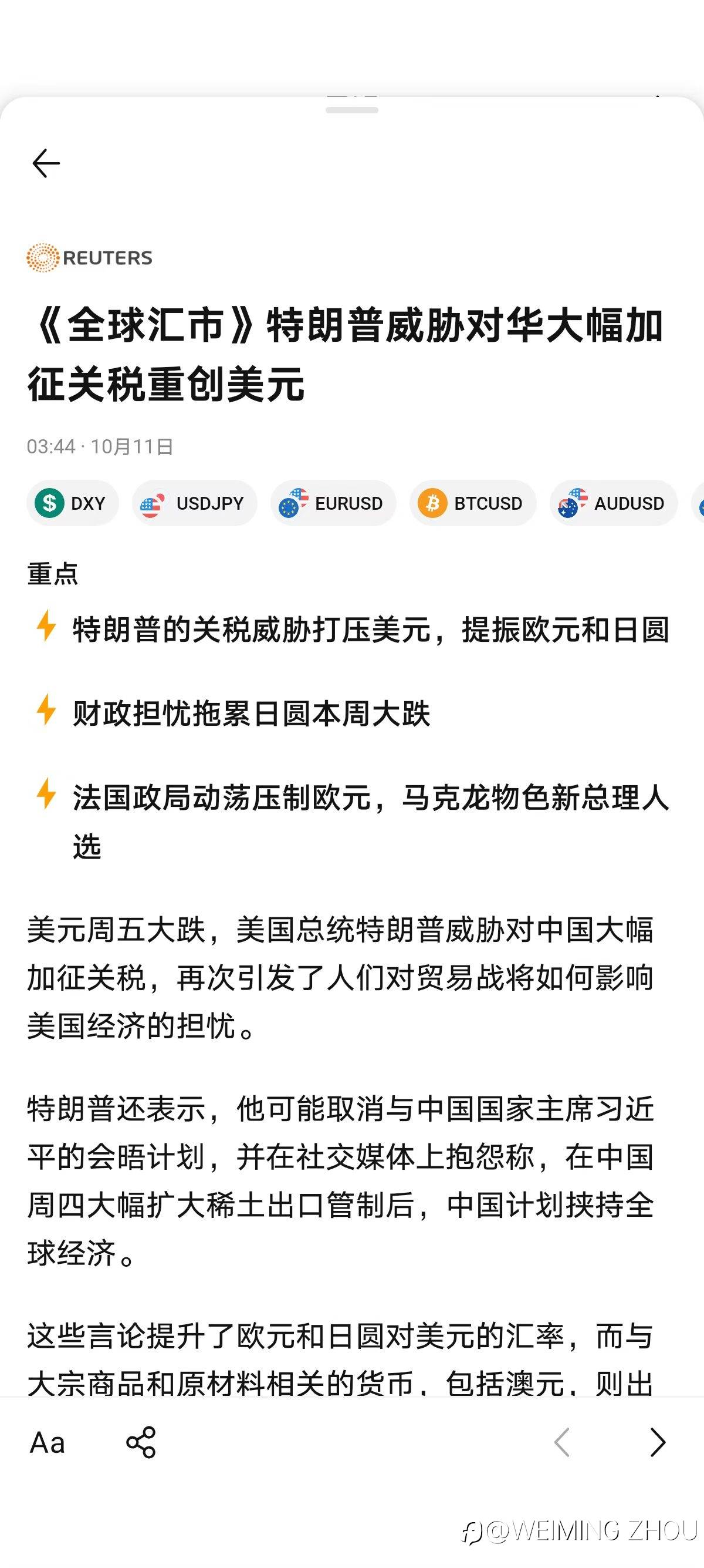REUTERS - 路透社 《全球汇市》特朗普威胁对华大幅加征关税重创美元 风险提示:本文所述仅代表作者个人观点,不代表 Followme 的官方立场。Followme 不对内容的准确性、完整性或可靠性作出任何保证,对于基于该内容所采取的任何行为,不承担任何责任,除非另有书面明确说明。
